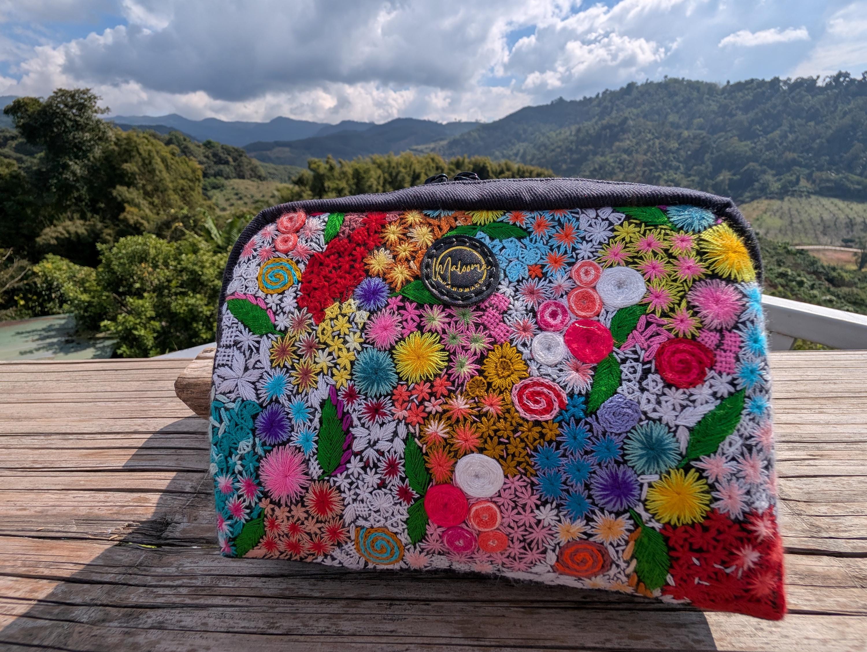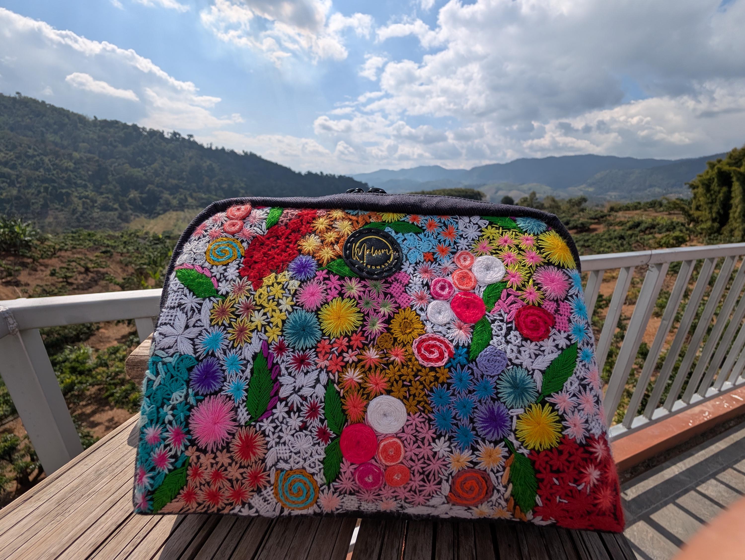 100% Hand Embroidery. All the patterns on our bag are actually hand embroidered by local people in Chiang Rai, Thailand. "For this bag, we use a hand-woven strap made by the Lisu Hill Tribe from northern Thailand."
