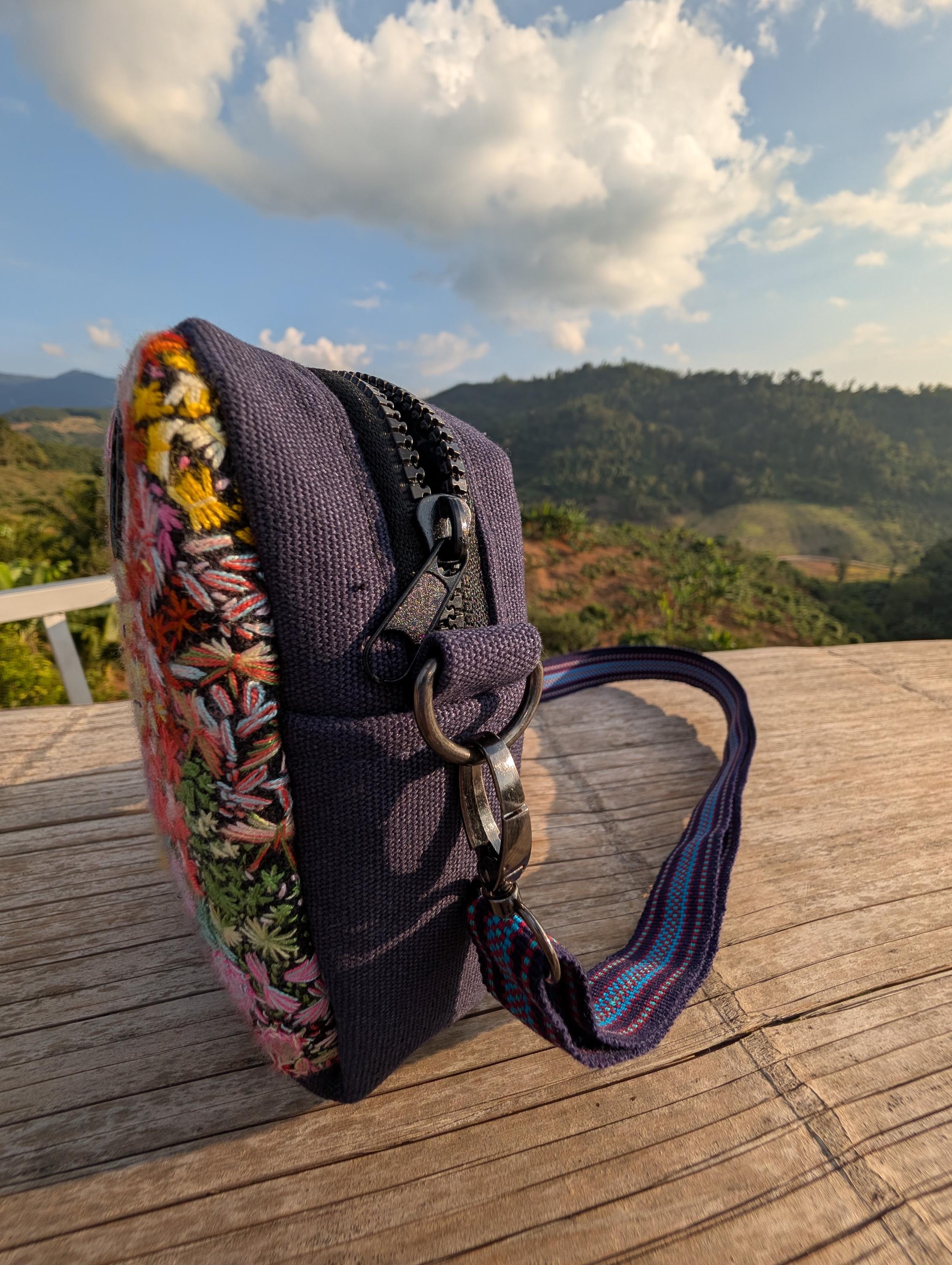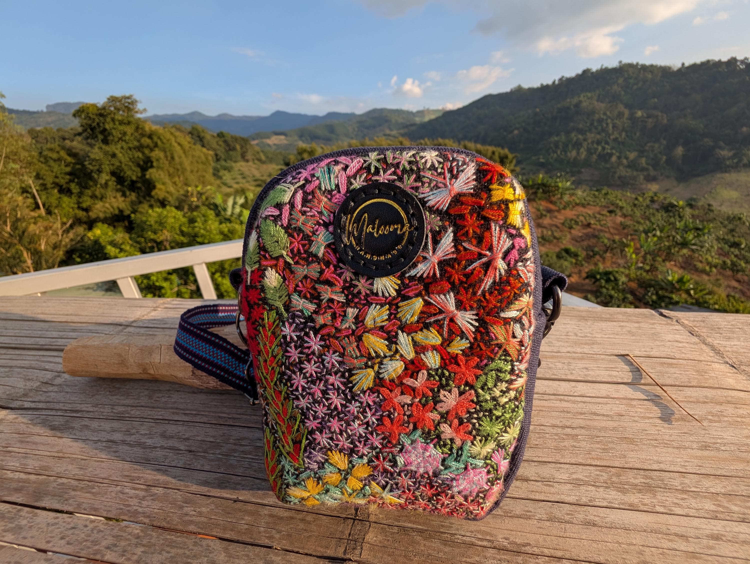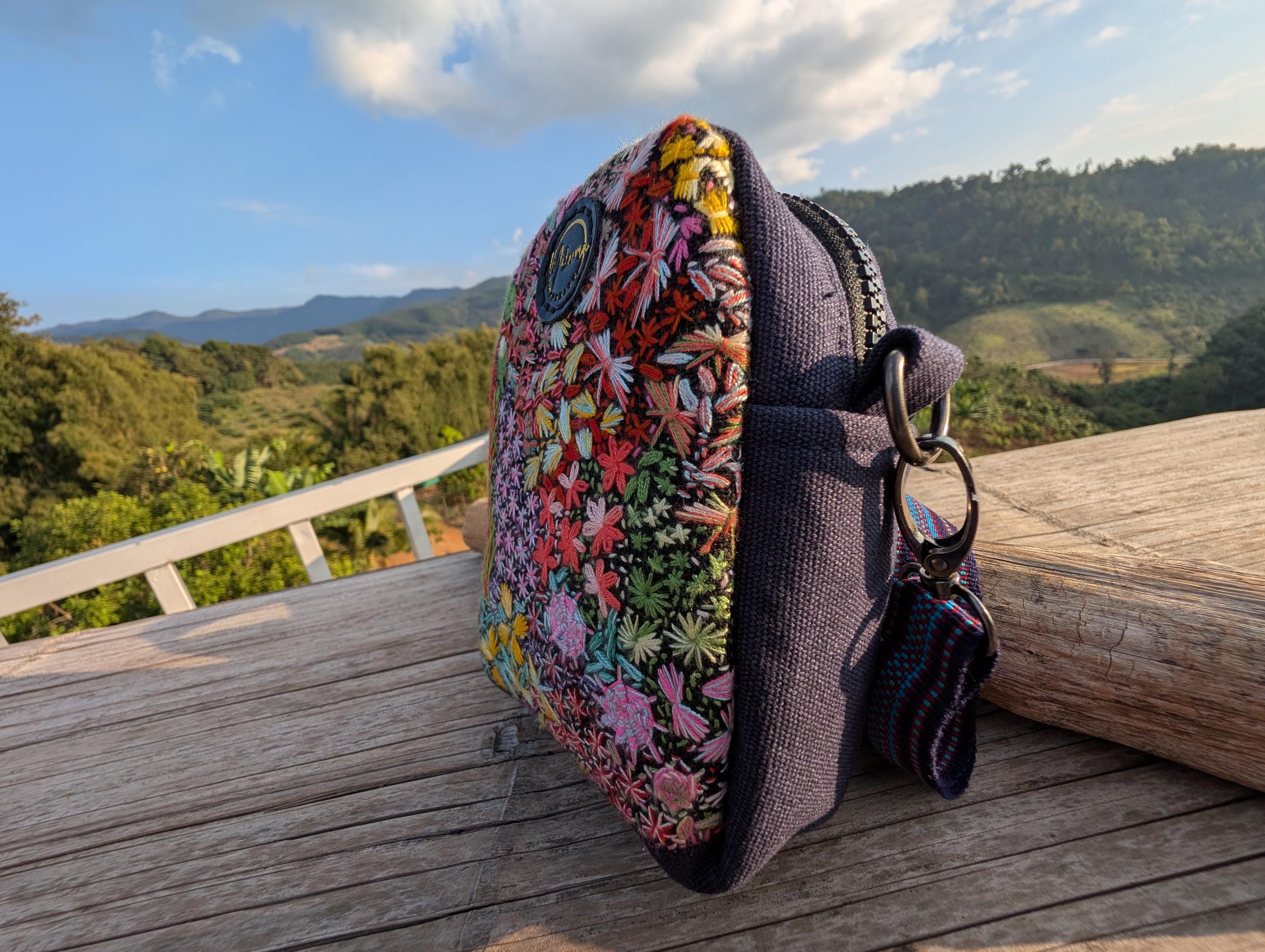 100% Hand Embroidery. All the patterns on our bag are actually hand embroidered by local people in Chiang Rai, Thailand. "For this bag, we use a hand-woven strap made by the Lisu Hill Tribe from northern Thailand."