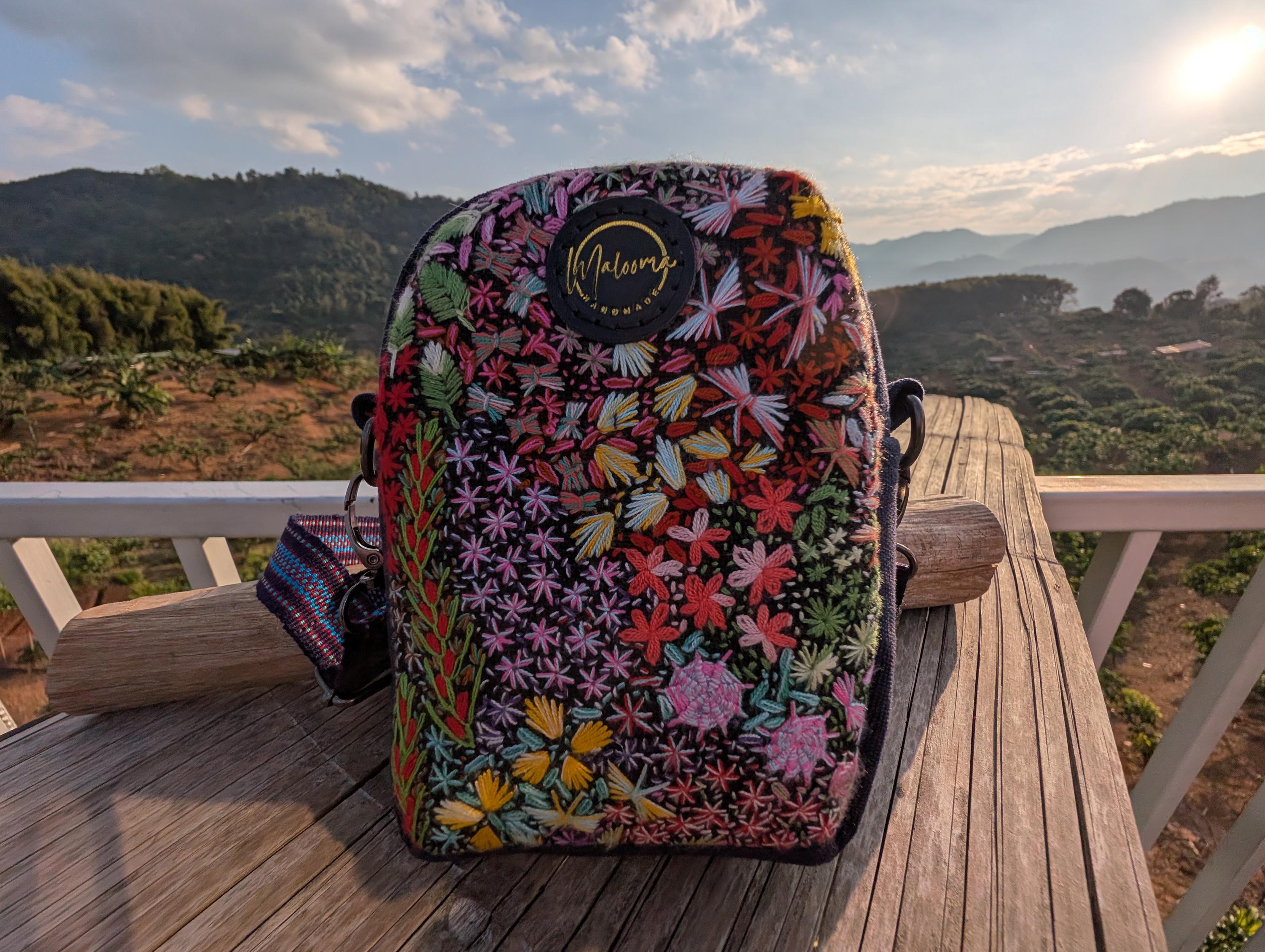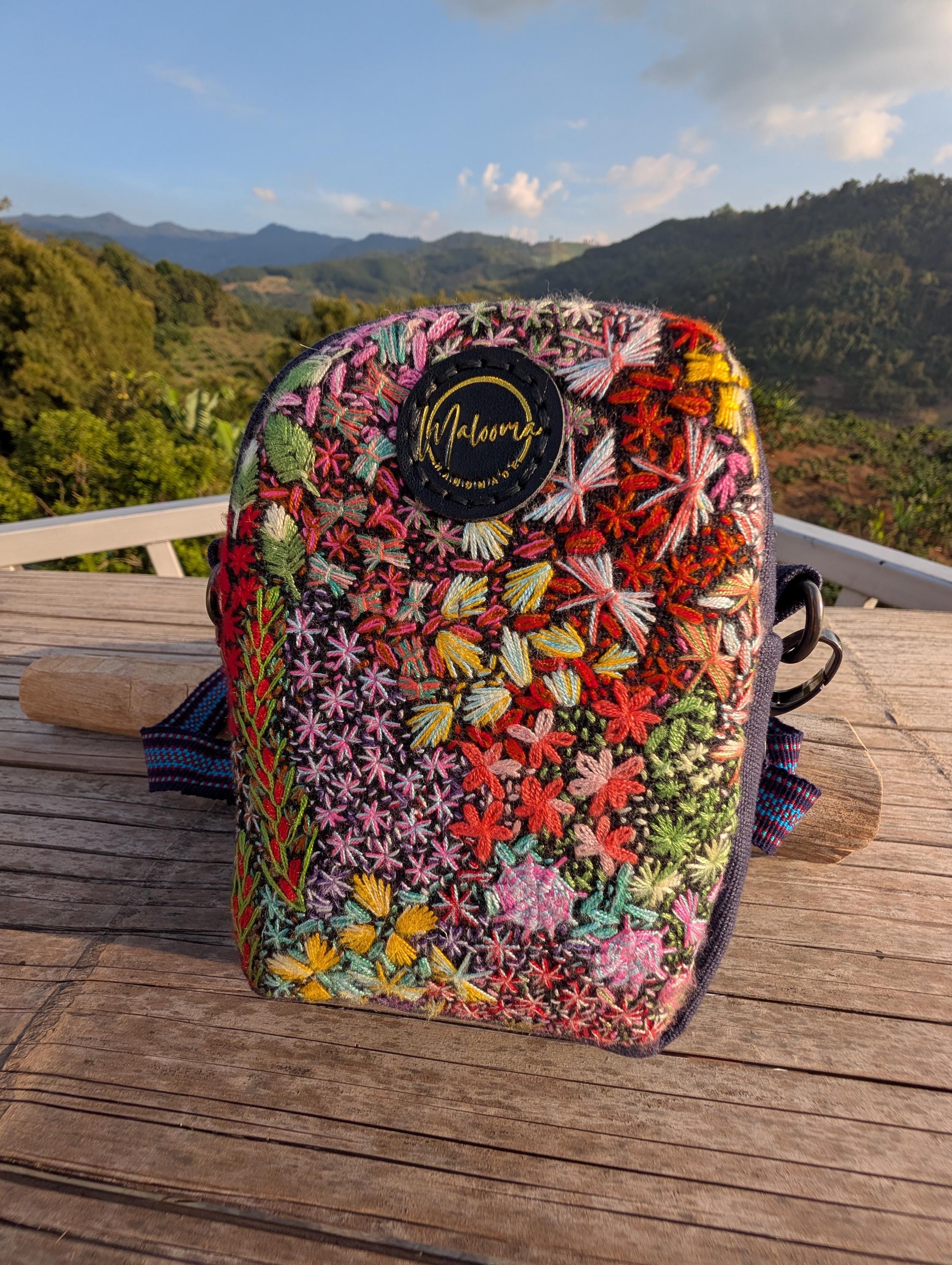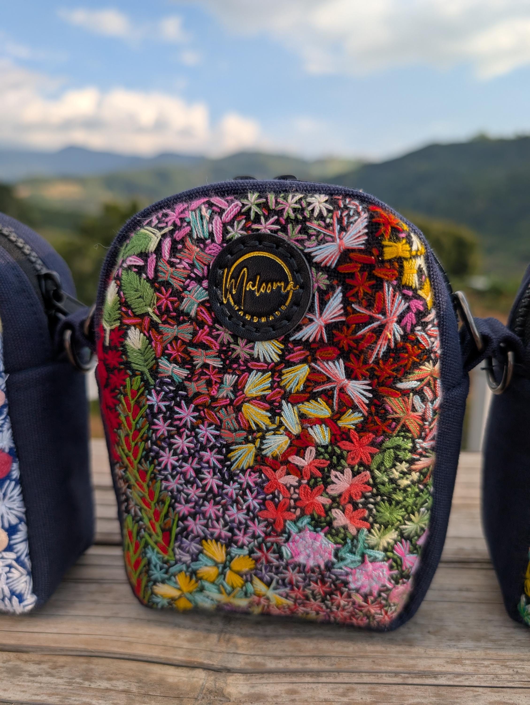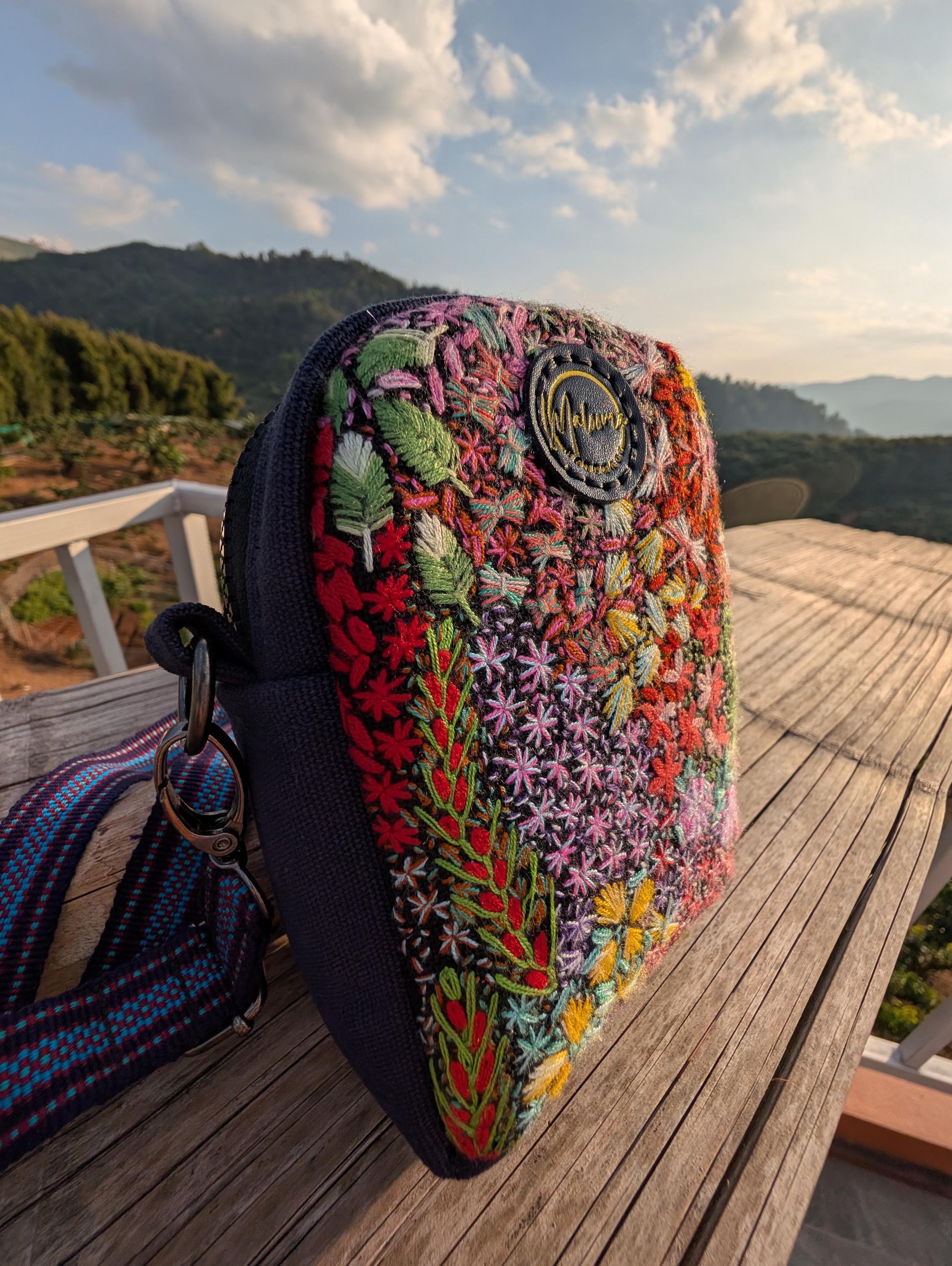 100% Hand Embroidery. All the patterns on our bag are actually hand embroidered by local people in Chiang Rai, Thailand. "For this bag, we use a hand-woven strap made by the Lisu Hill Tribe from northern Thailand."