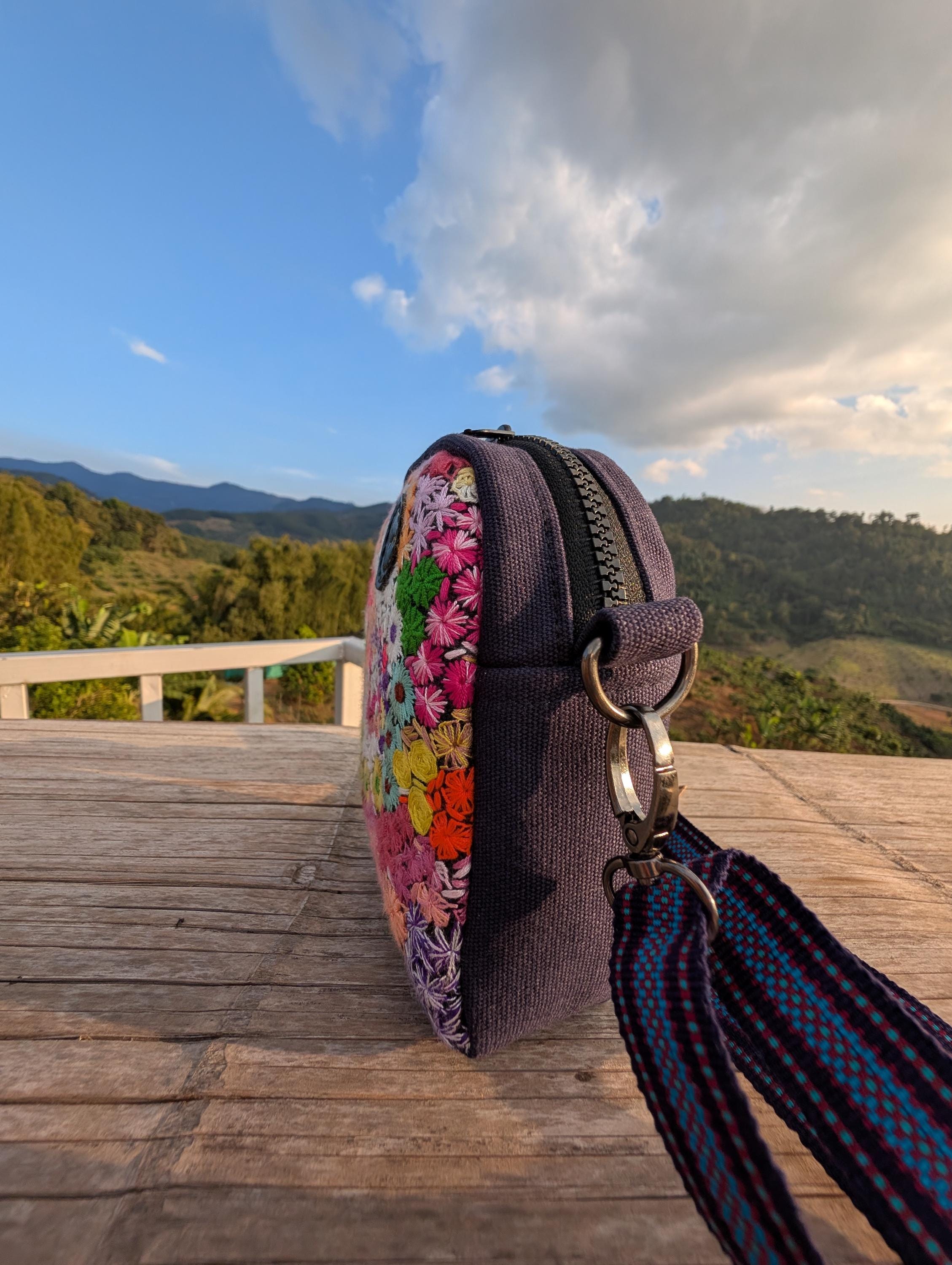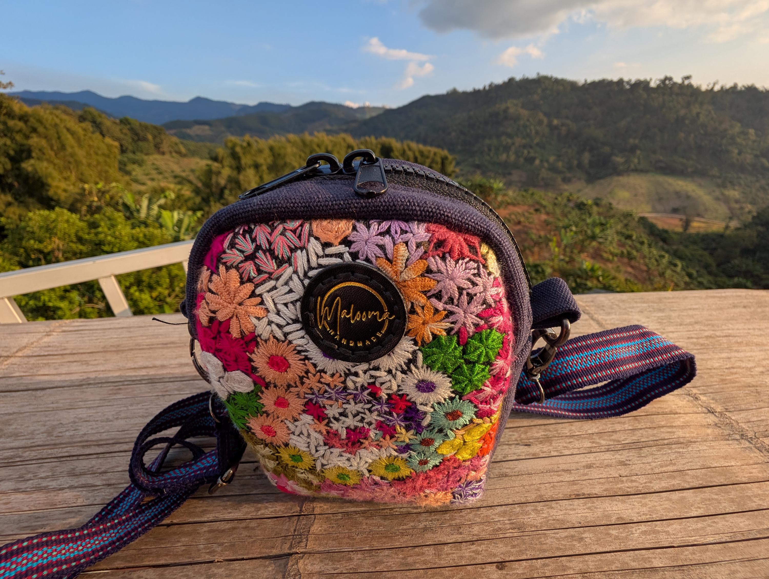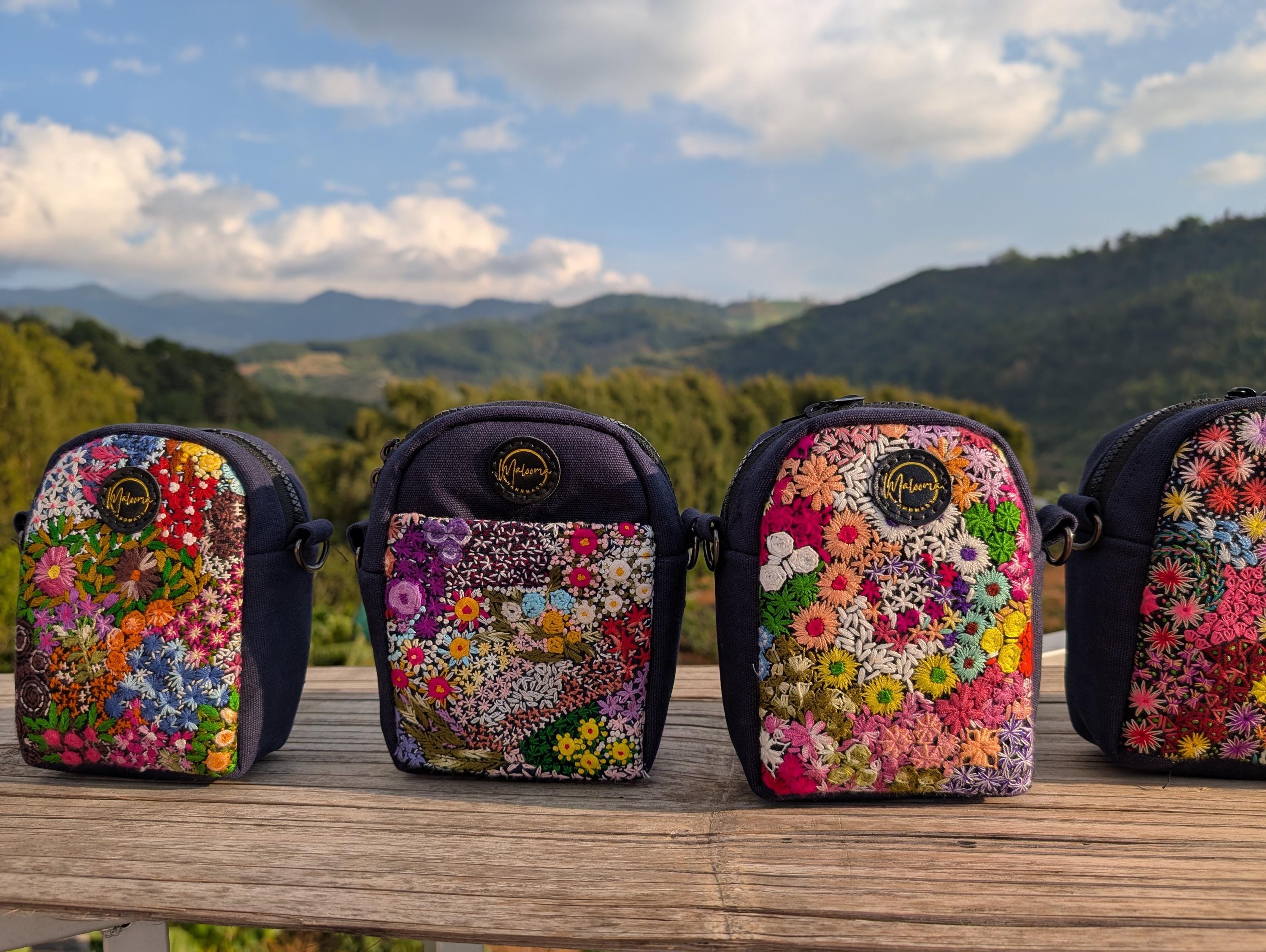 100% Hand Embroidery. All the patterns on our bag are actually hand embroidered by local people in Chiang Rai, Thailand. "For this bag, we use a hand-woven strap made by the Lisu Hill Tribe from northern Thailand."