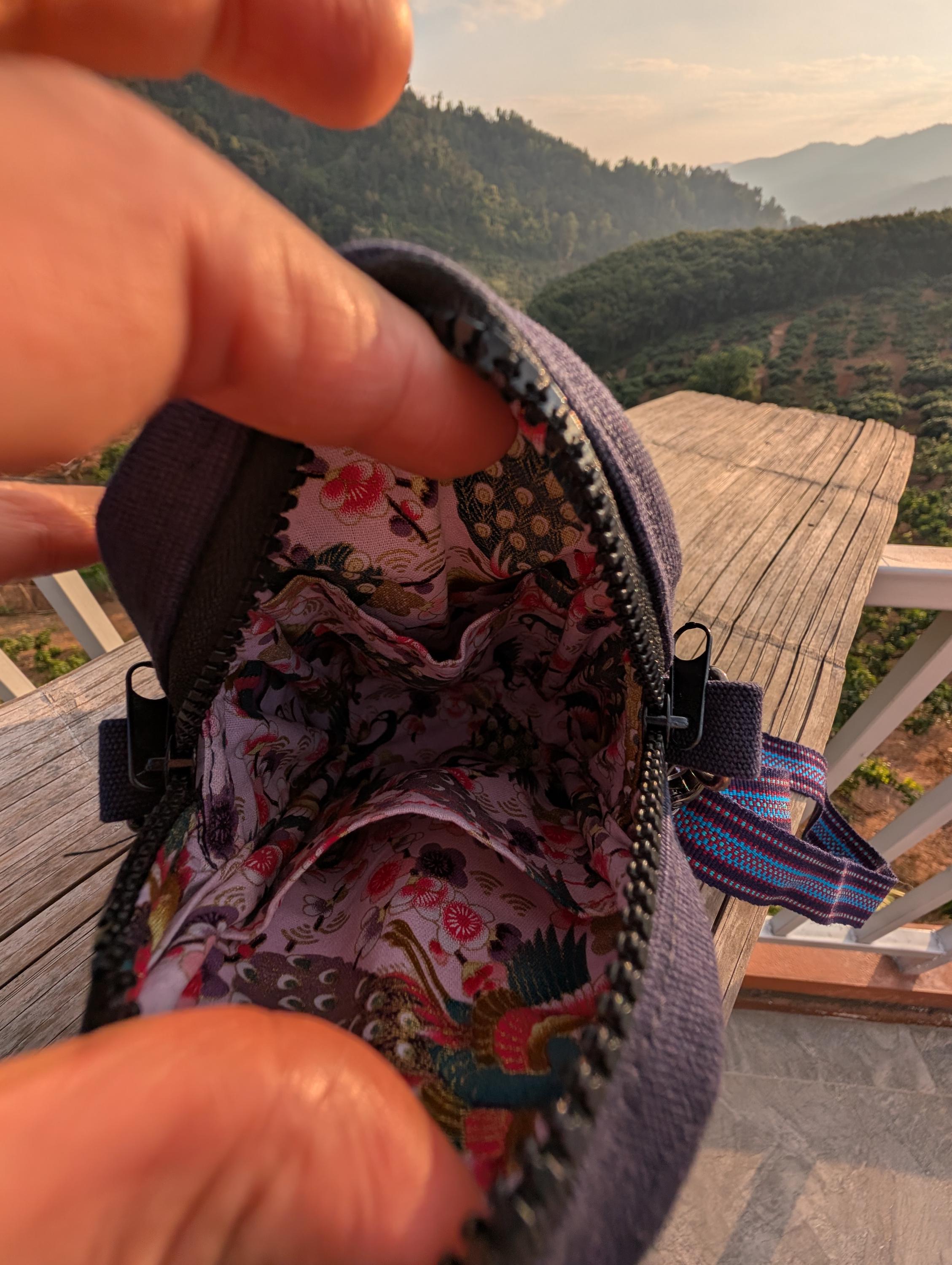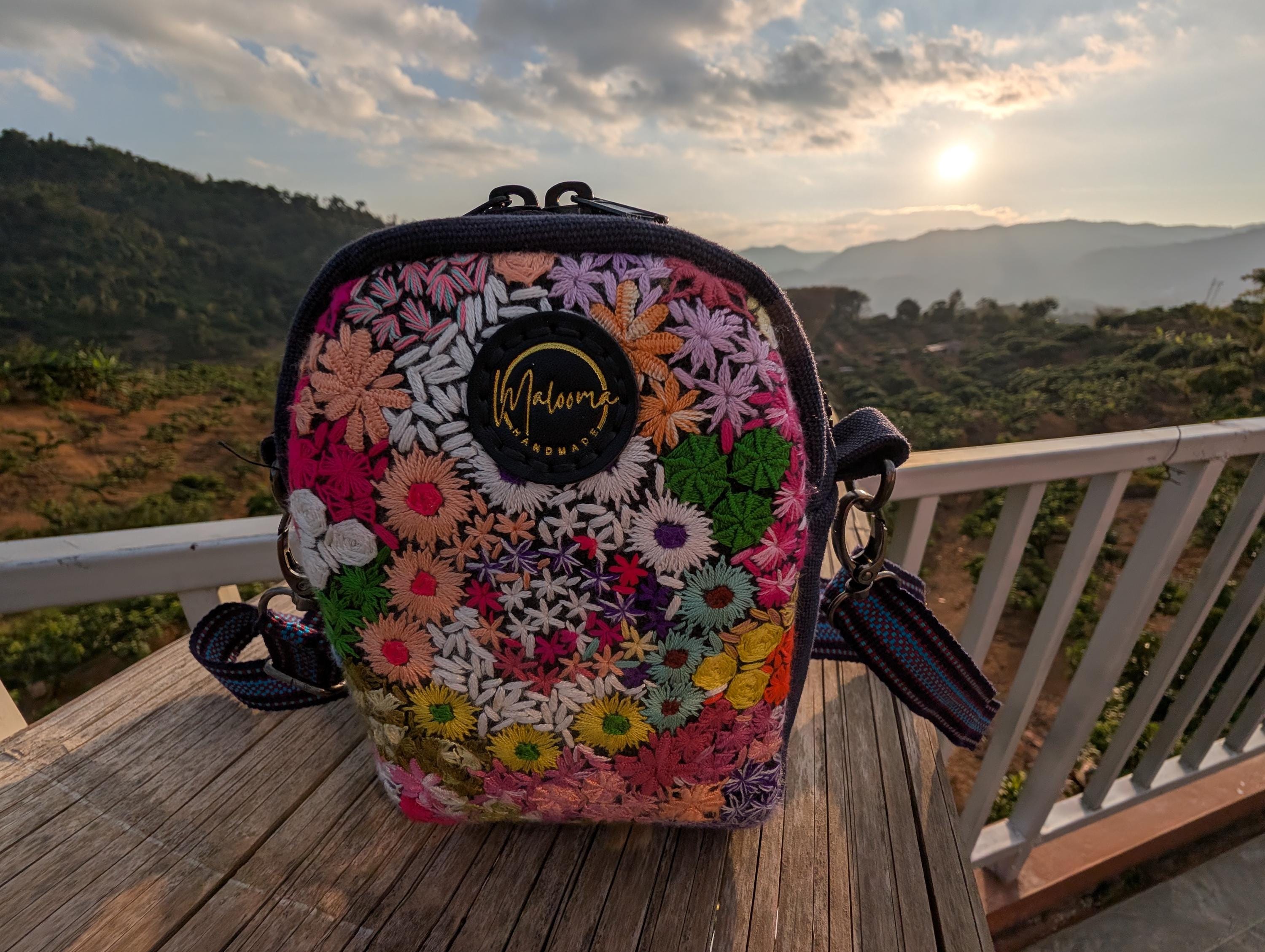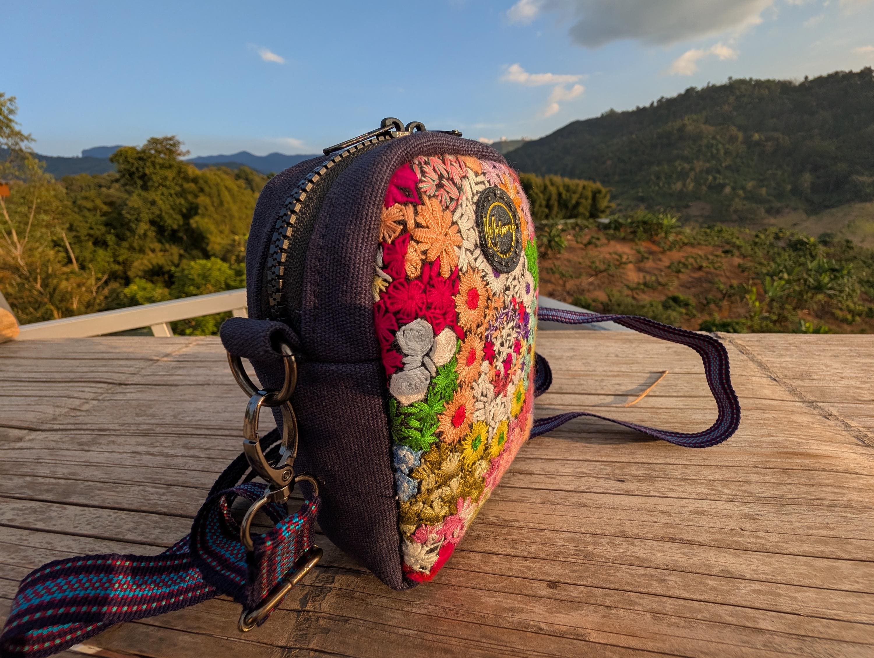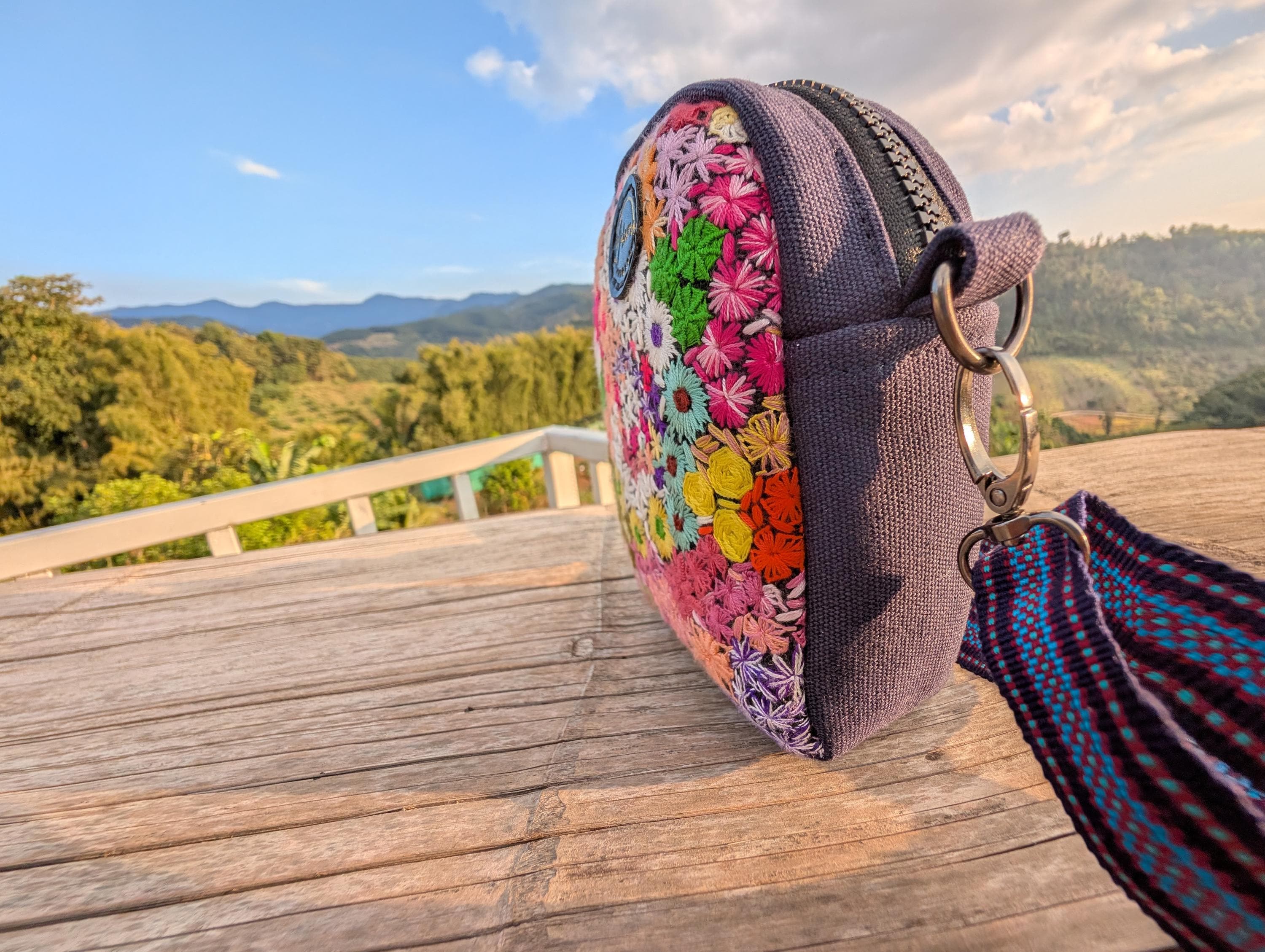 100% Hand Embroidery. All the patterns on our bag are actually hand embroidered by local people in Chiang Rai, Thailand. "For this bag, we use a hand-woven strap made by the Lisu Hill Tribe from northern Thailand."