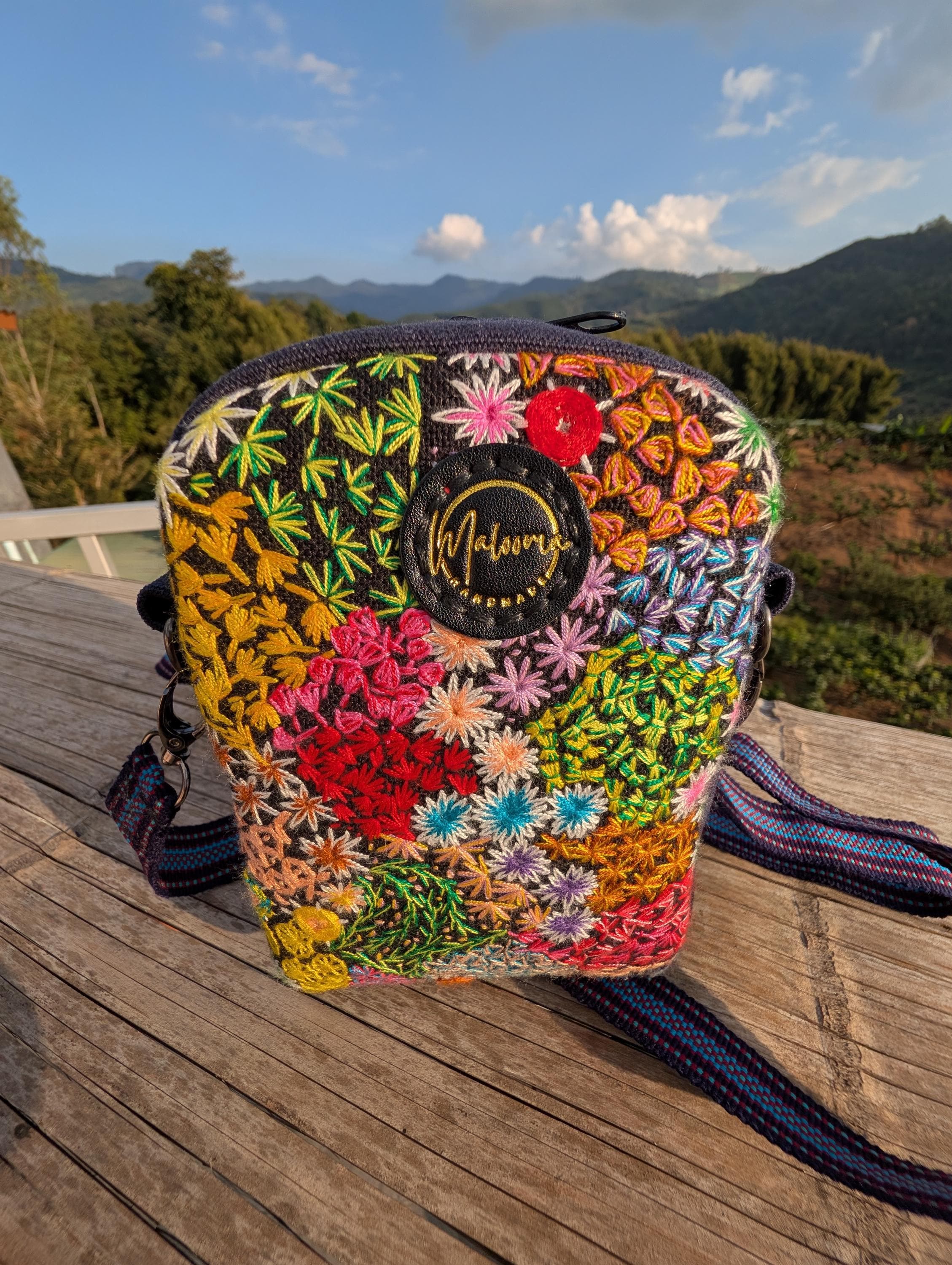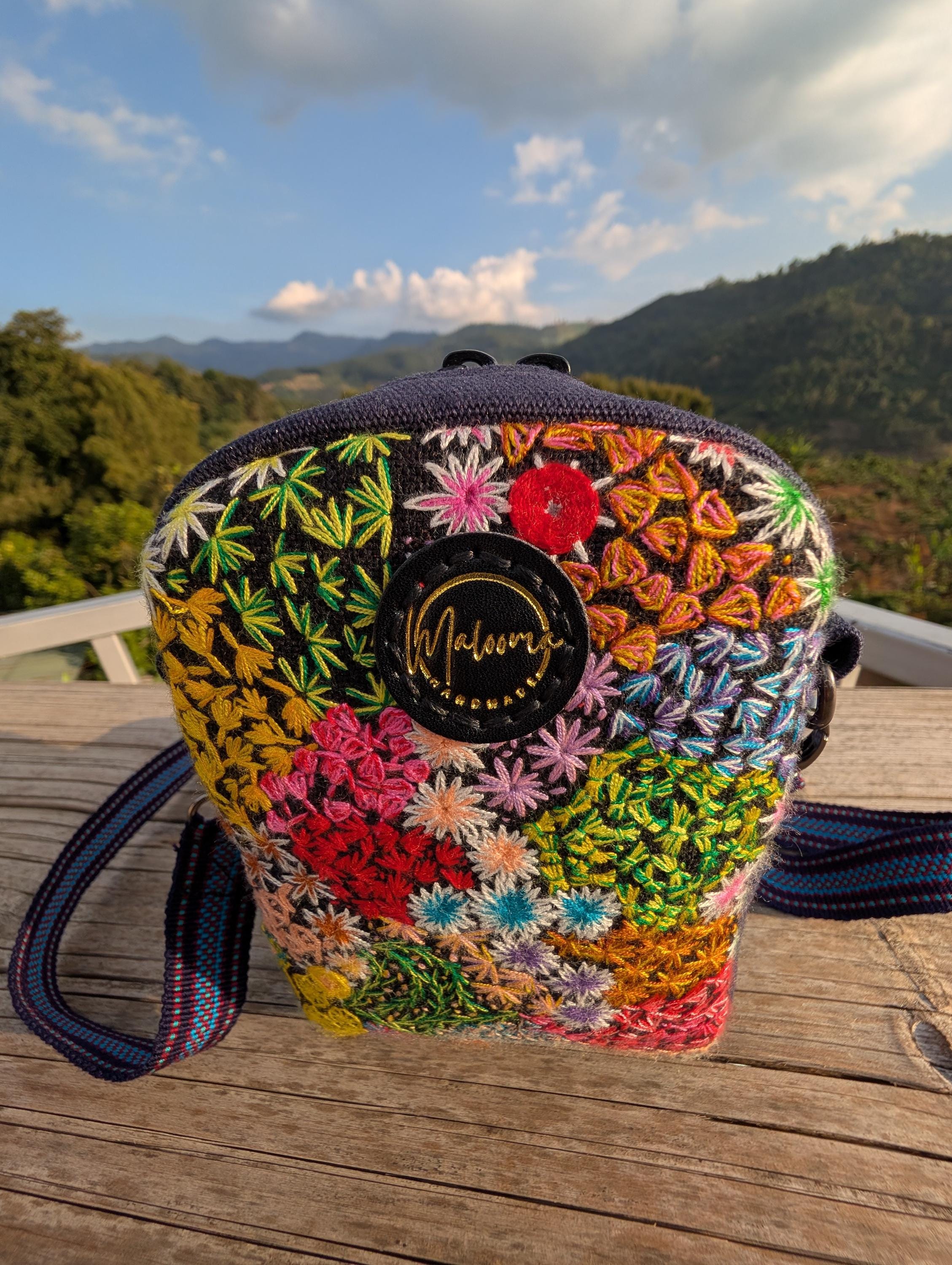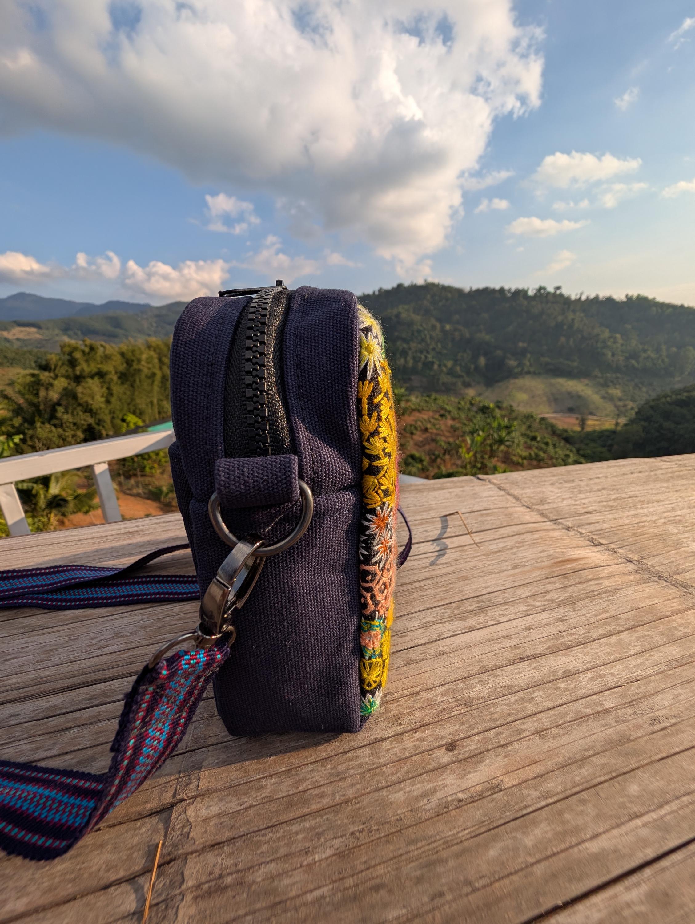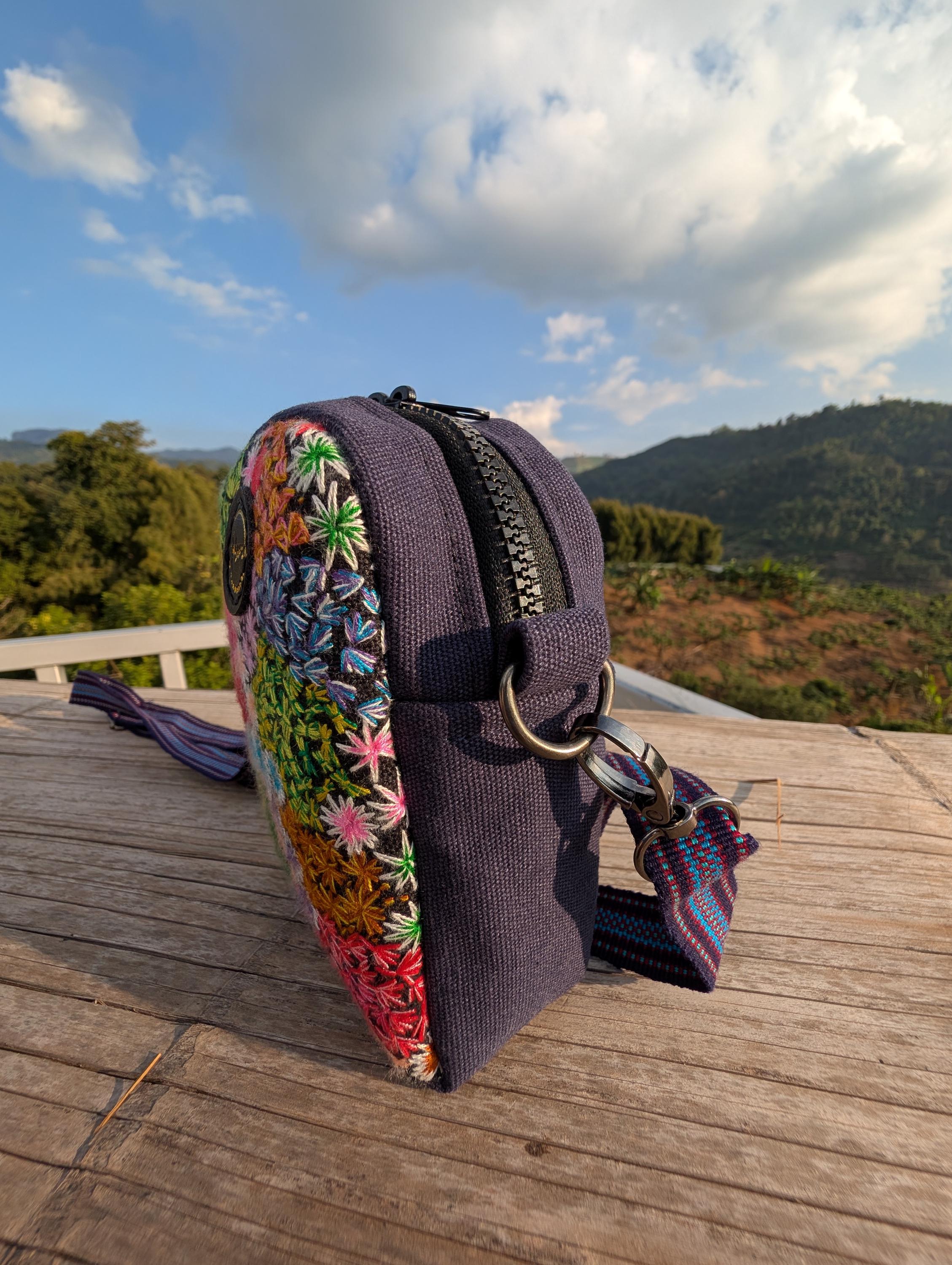 100% Hand Embroidery. All the patterns on our bag are actually hand embroidered by local people in Chiang Rai, Thailand. "For this bag, we use a hand-woven strap made by the Lisu Hill Tribe from northern Thailand."