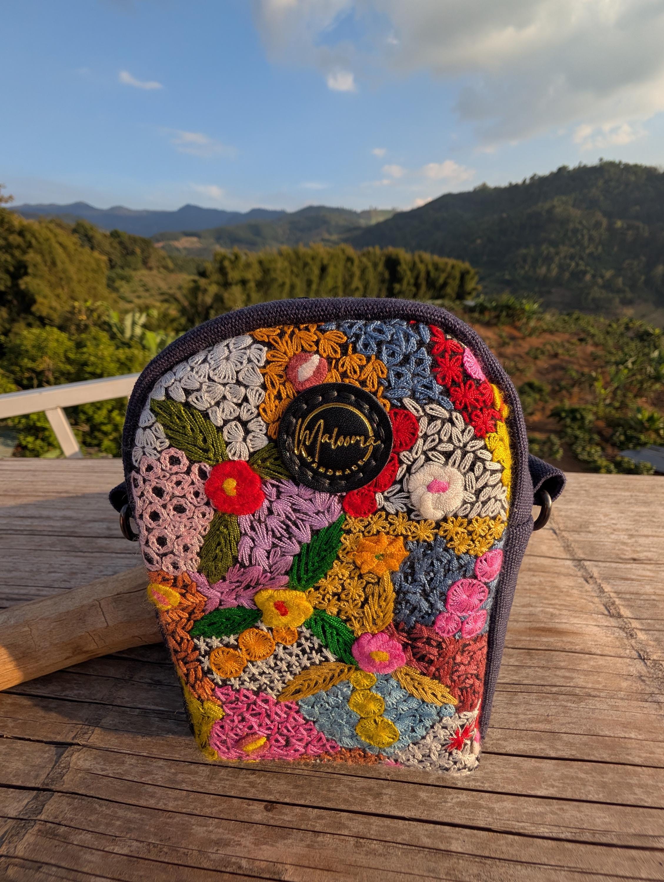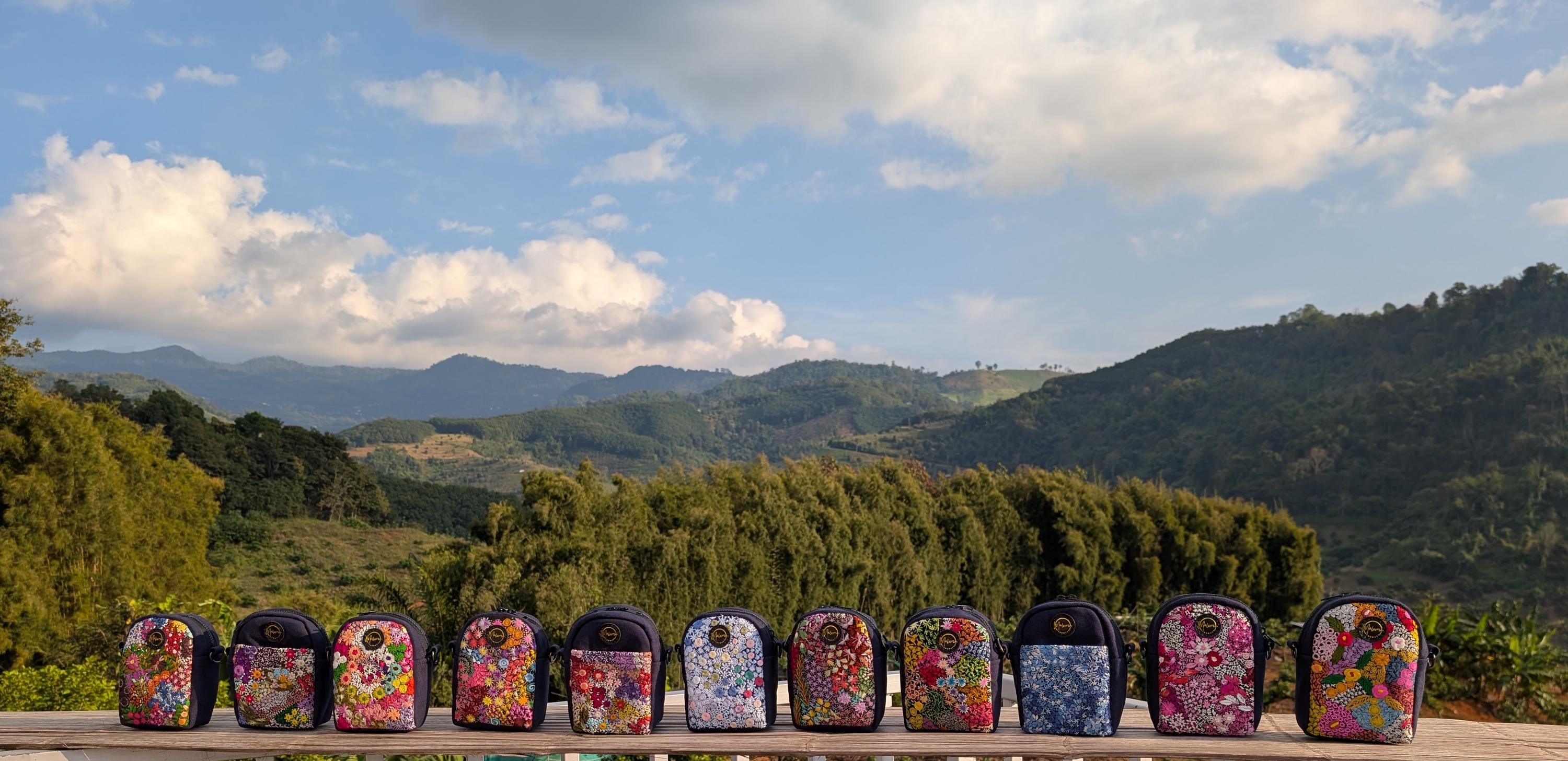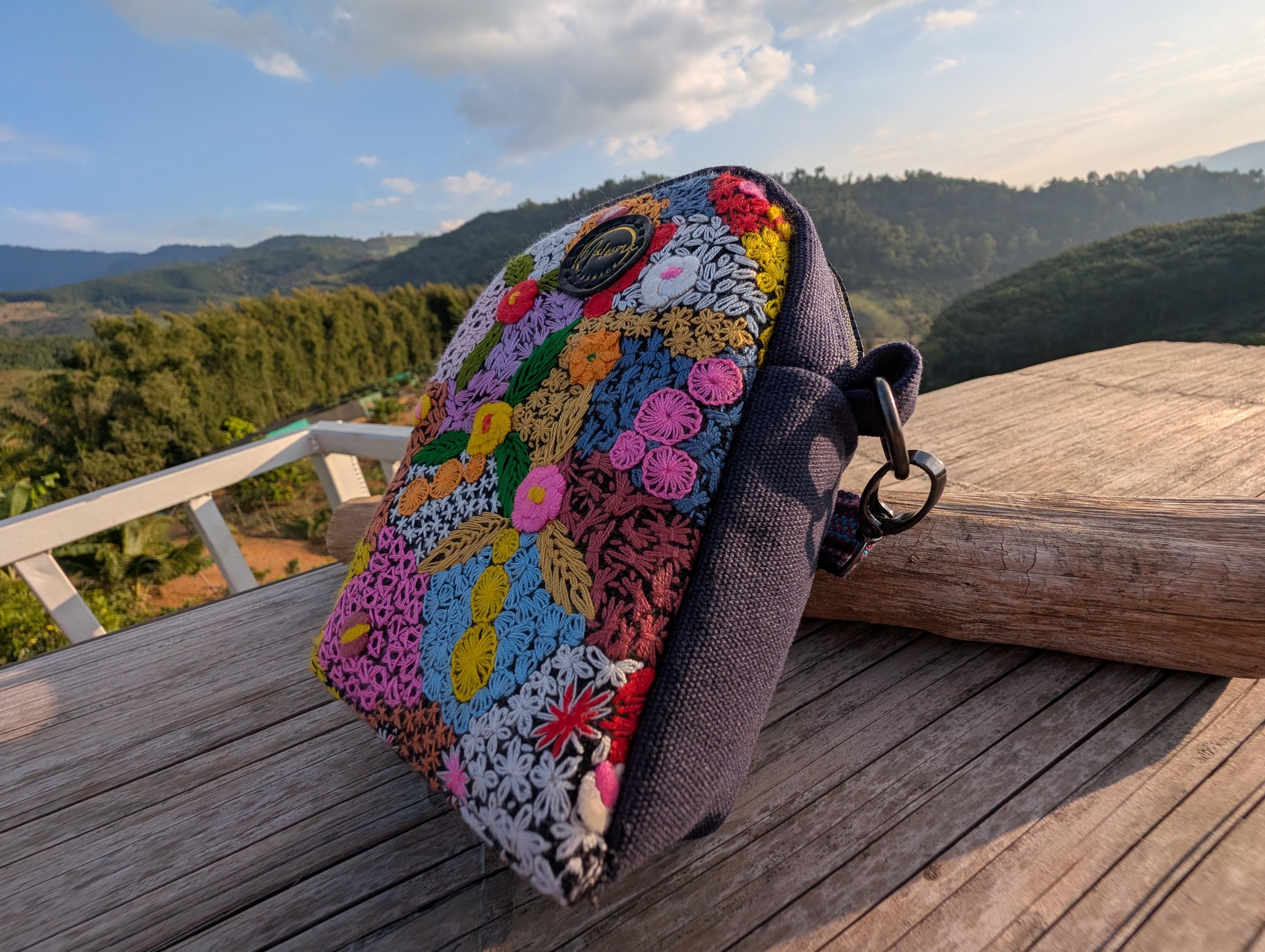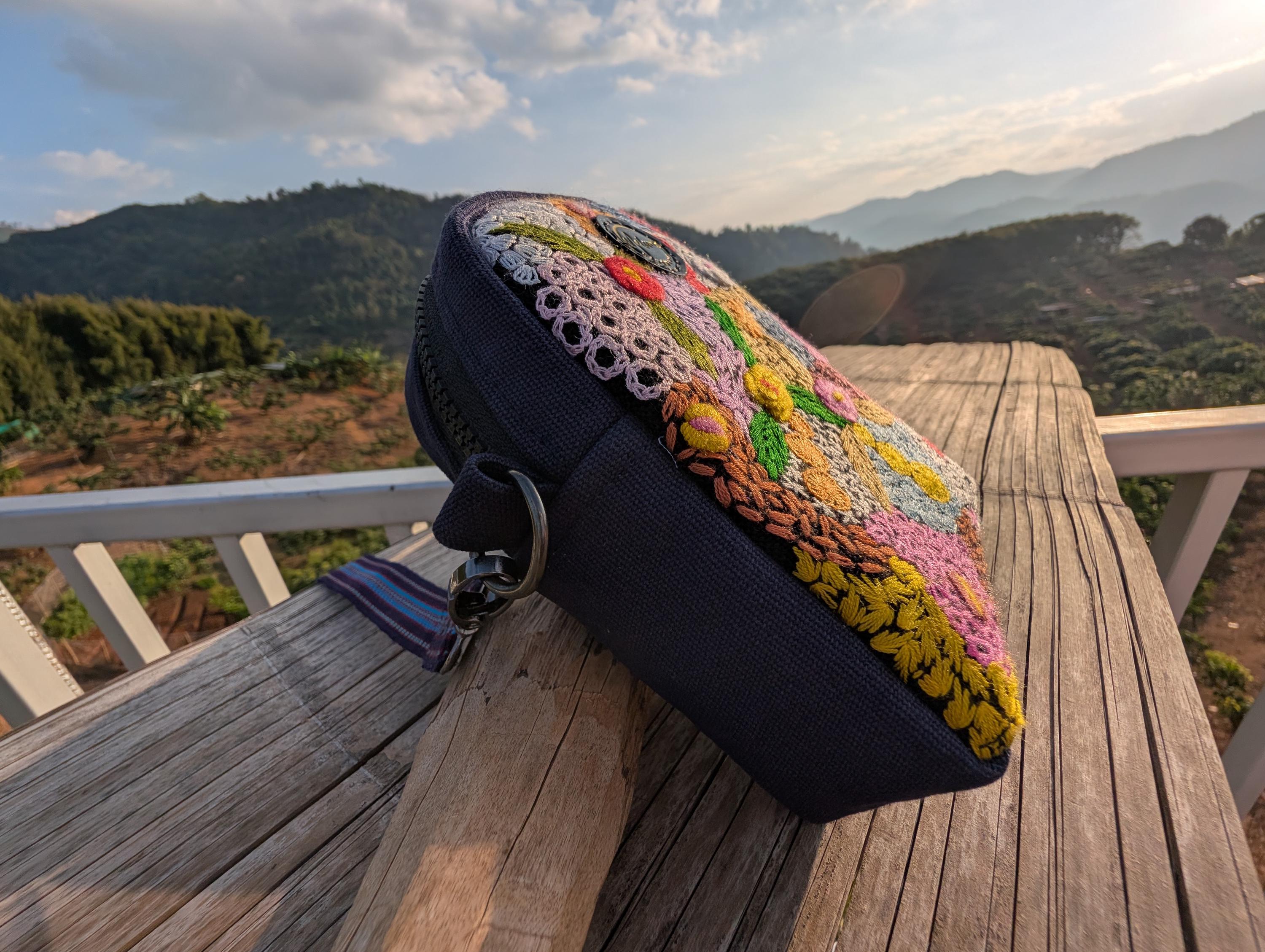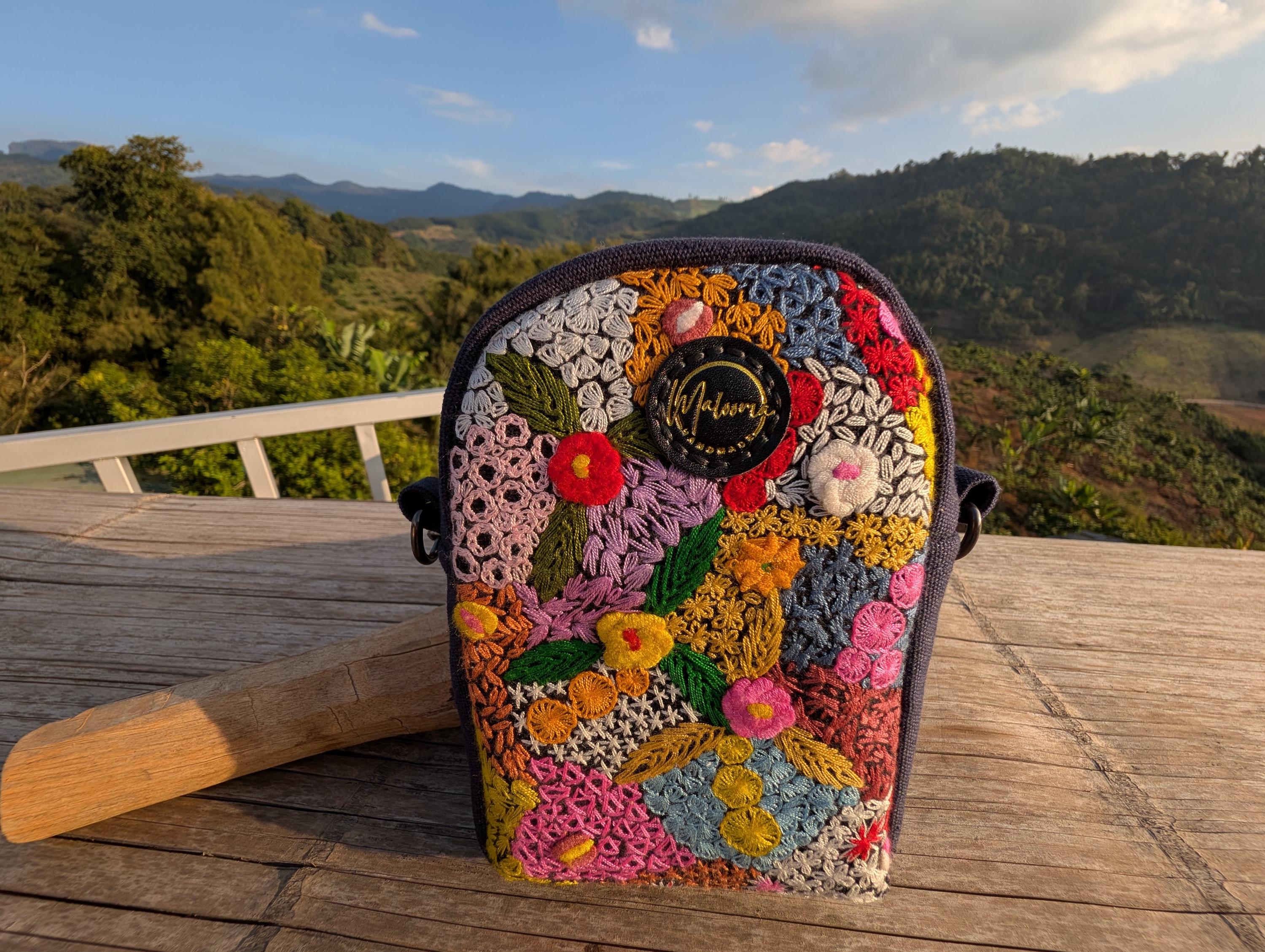 100% Hand Embroidery. All the patterns on our bag are actually hand embroidered by local people in Chiang Rai, Thailand. "For this bag, we use a hand-woven strap made by the Lisu Hill Tribe from northern Thailand."