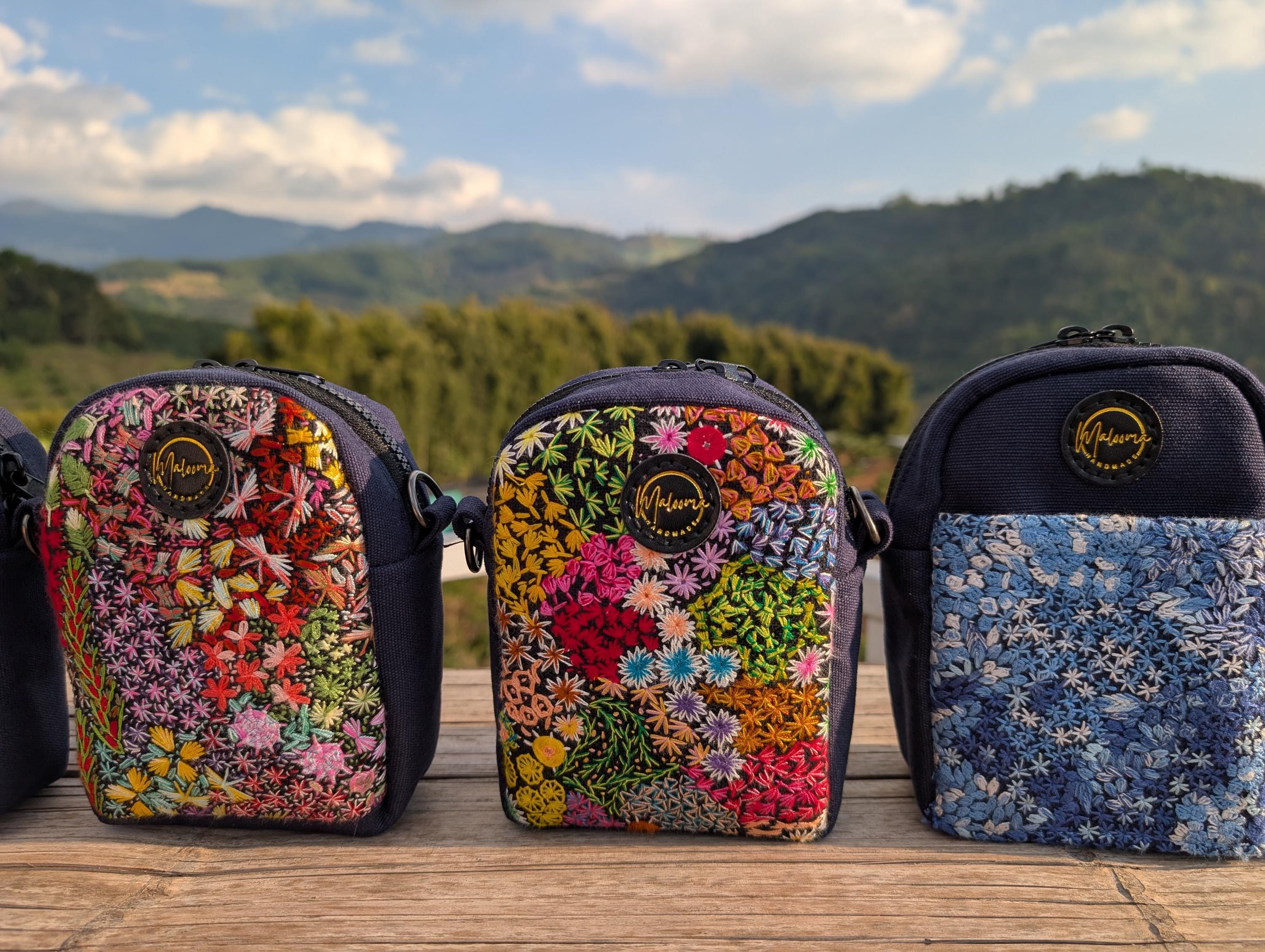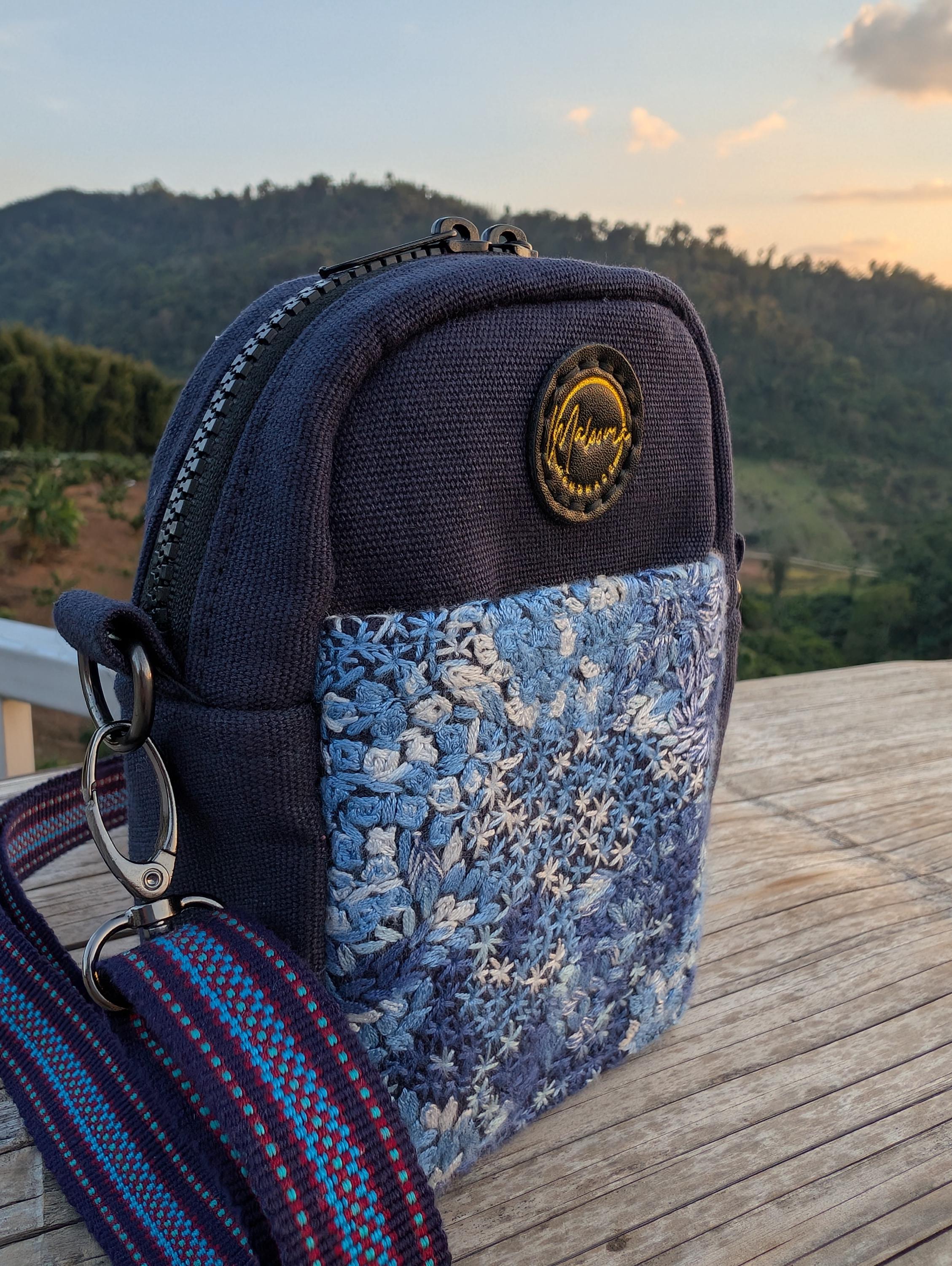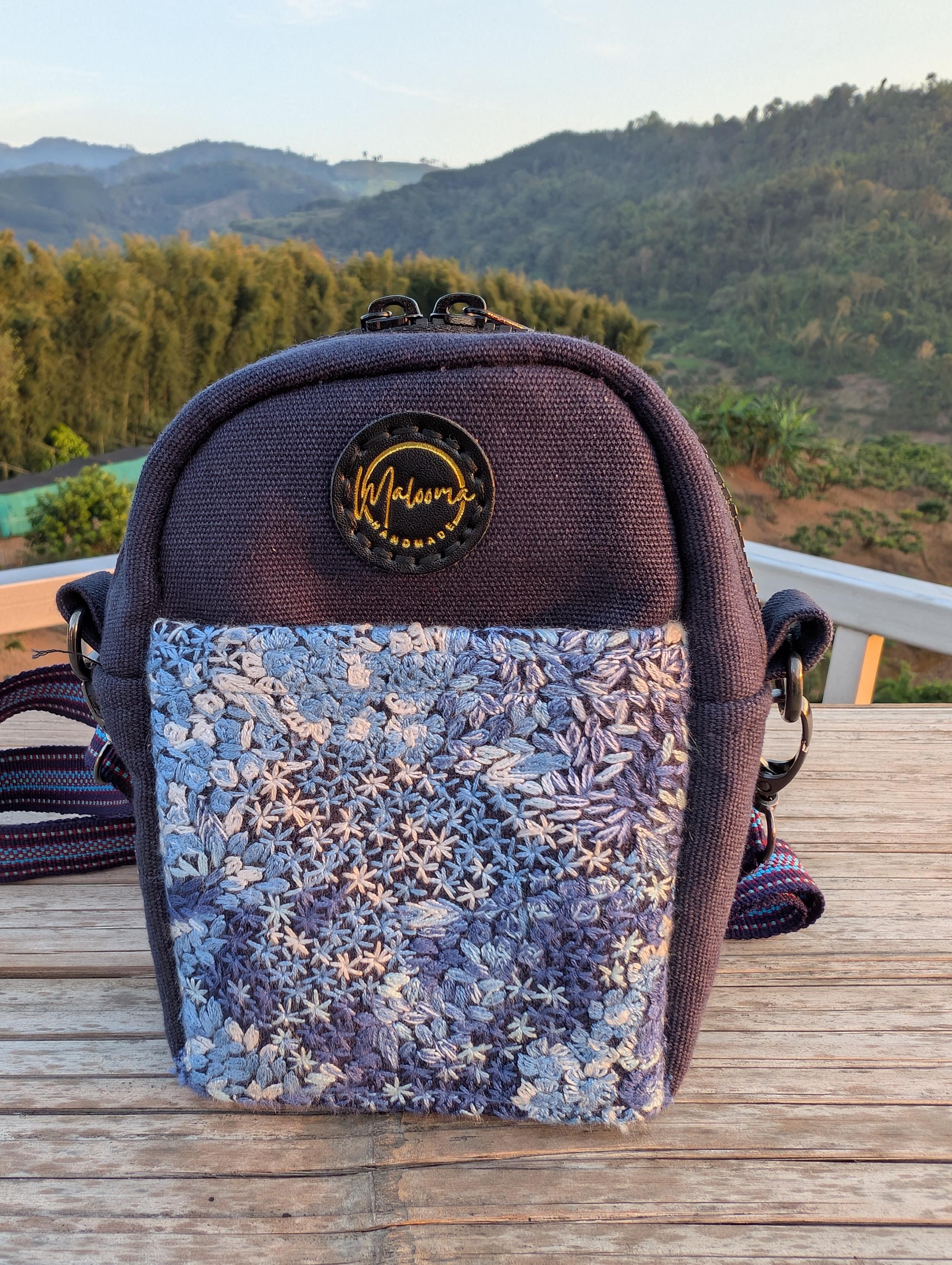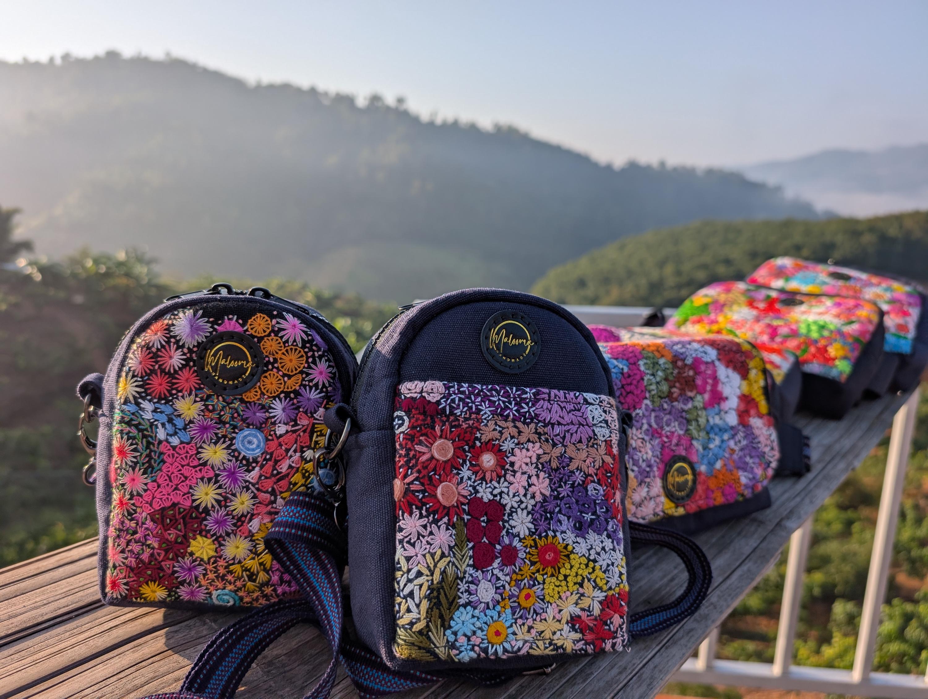 100% Hand Embroidery. All the patterns on our bag are actually hand embroidered by local people in Chiang Rai, Thailand. "For this bag, we use a hand-woven strap made by the Lisu Hill Tribe from northern Thailand."