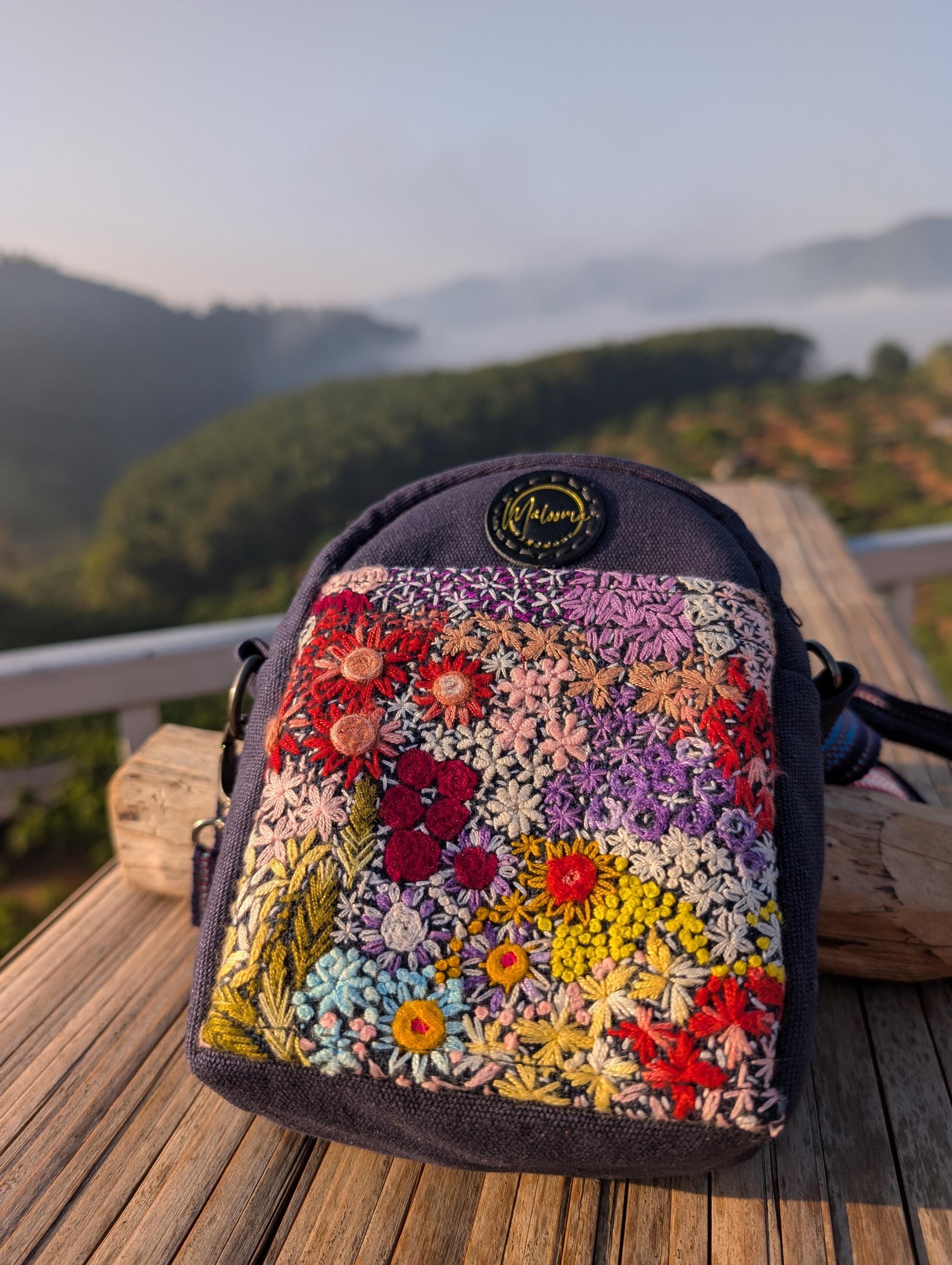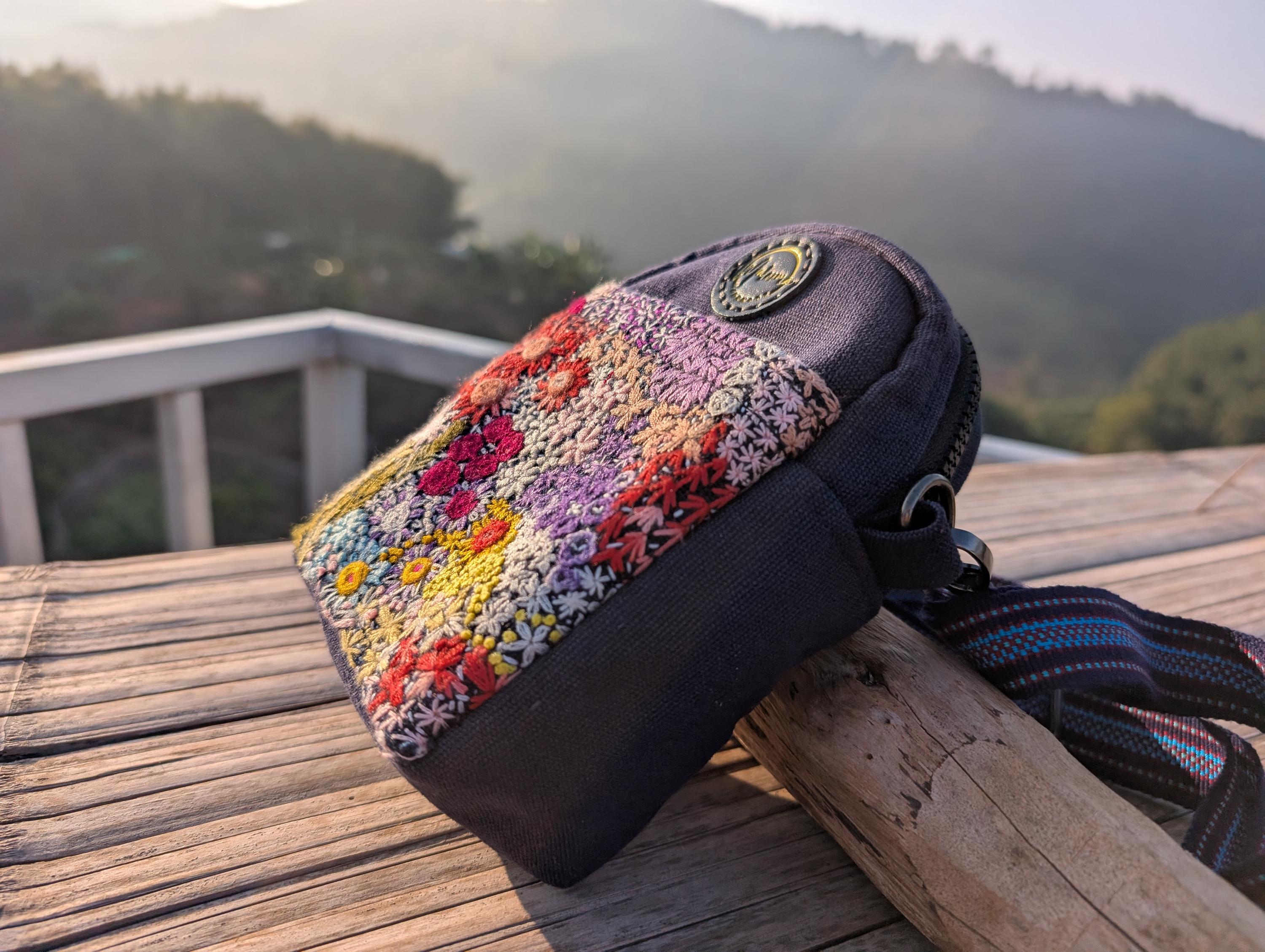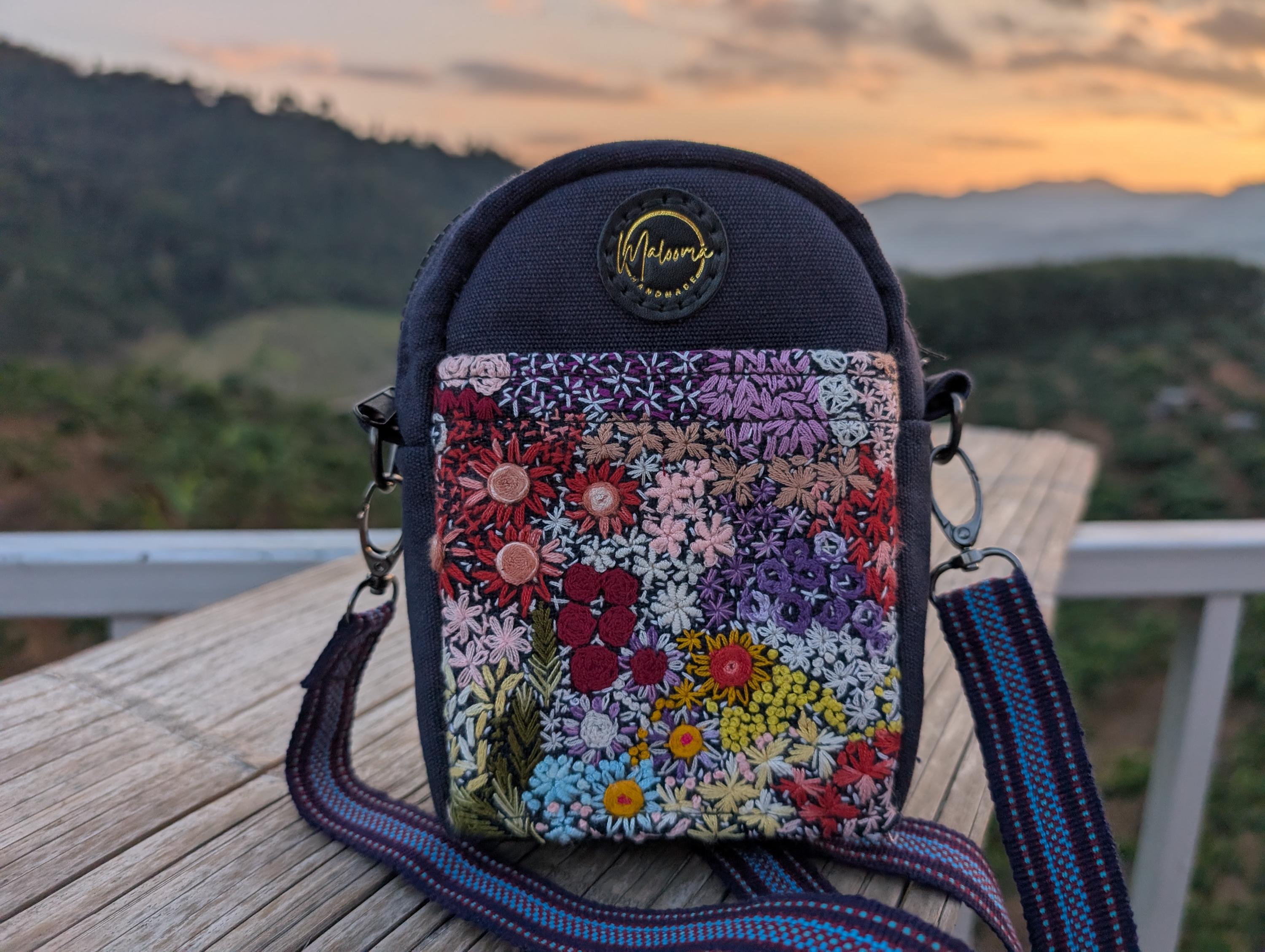 100% Hand Embroidery. All the patterns on our bag are actually hand embroidered by local people in Chiang Rai, Thailand. "For this bag, we use a hand-woven strap made by the Lisu Hill Tribe from northern Thailand."