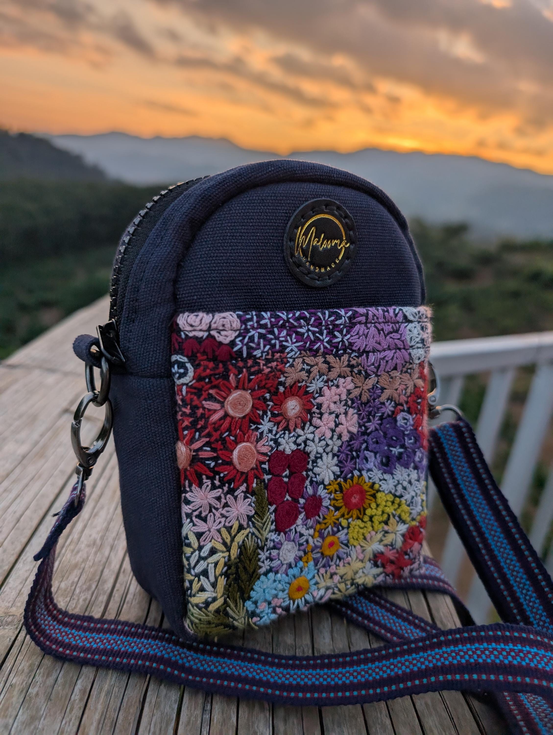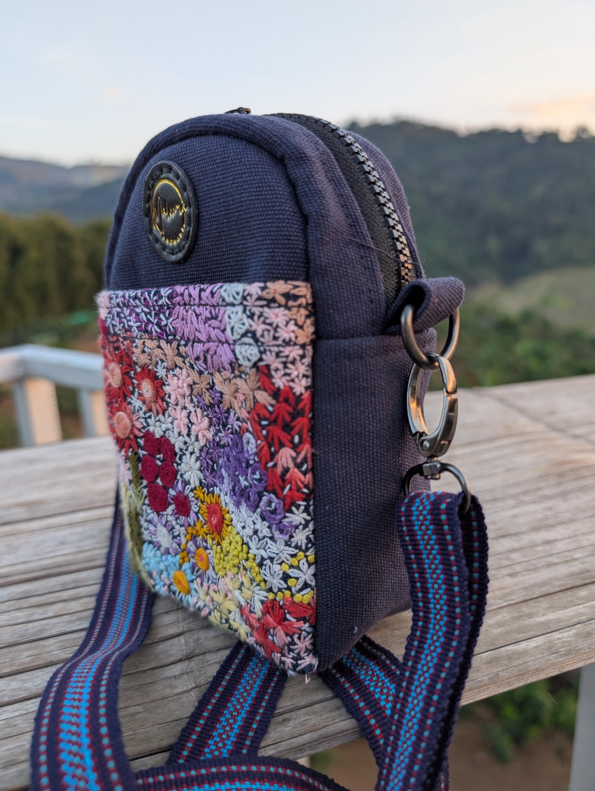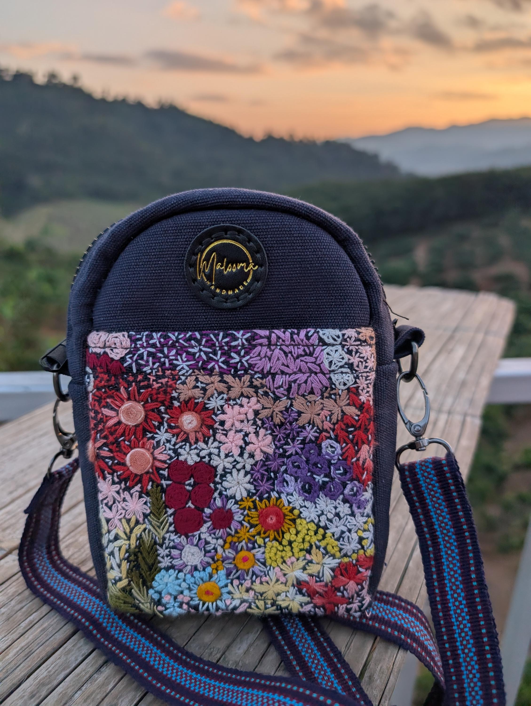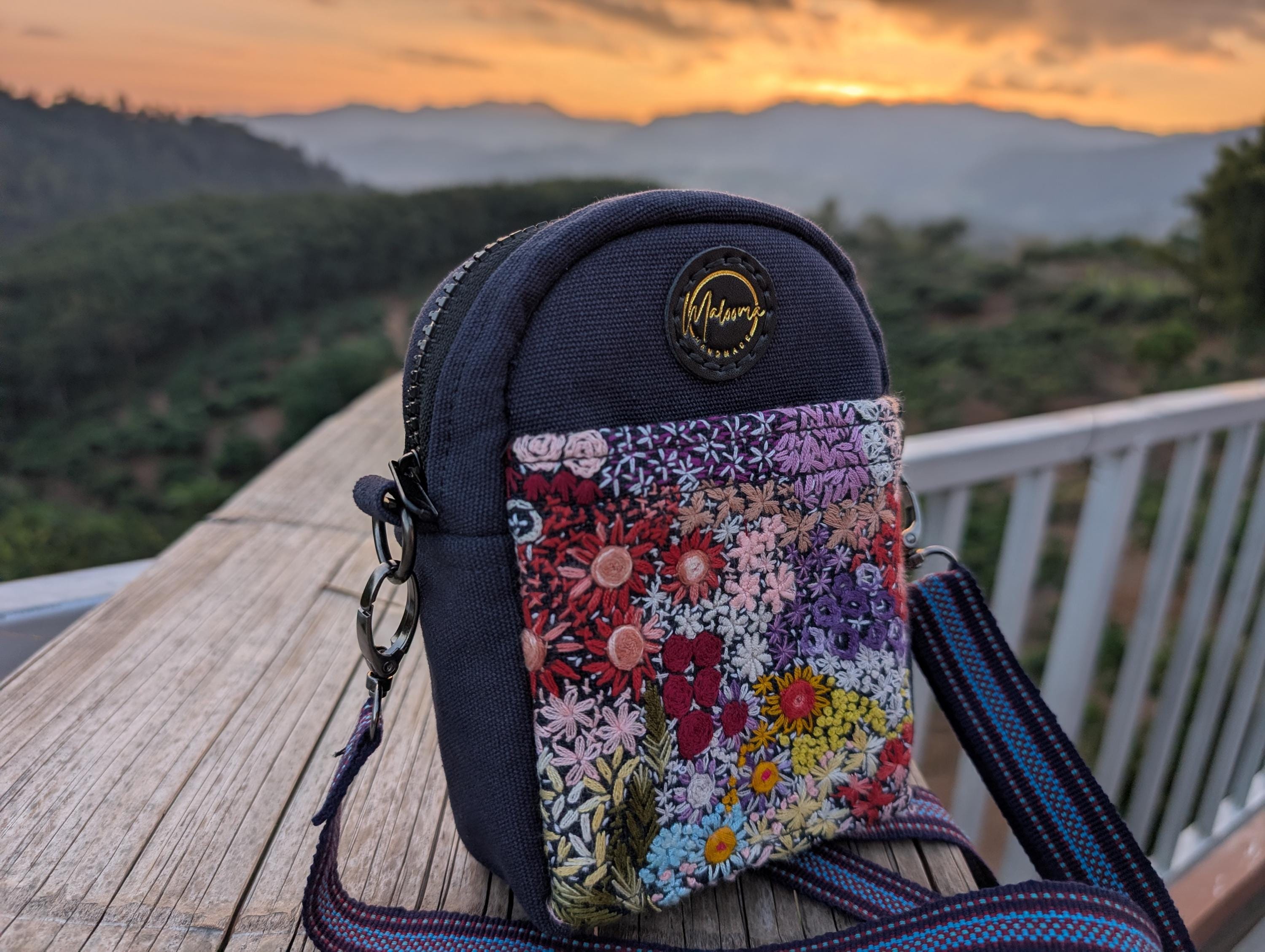 100% Hand Embroidery. All the patterns on our bag are actually hand embroidered by local people in Chiang Rai, Thailand. "For this bag, we use a hand-woven strap made by the Lisu Hill Tribe from northern Thailand."