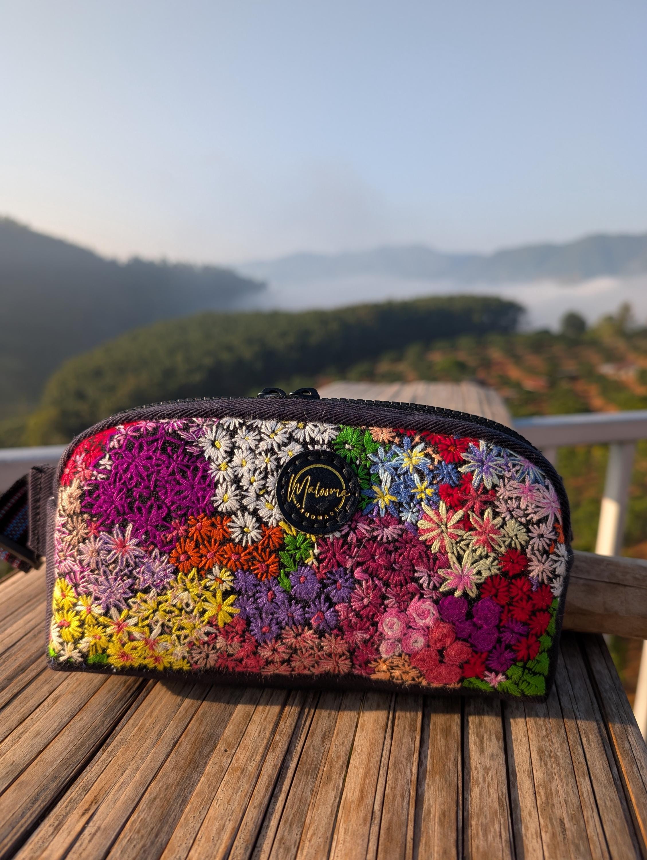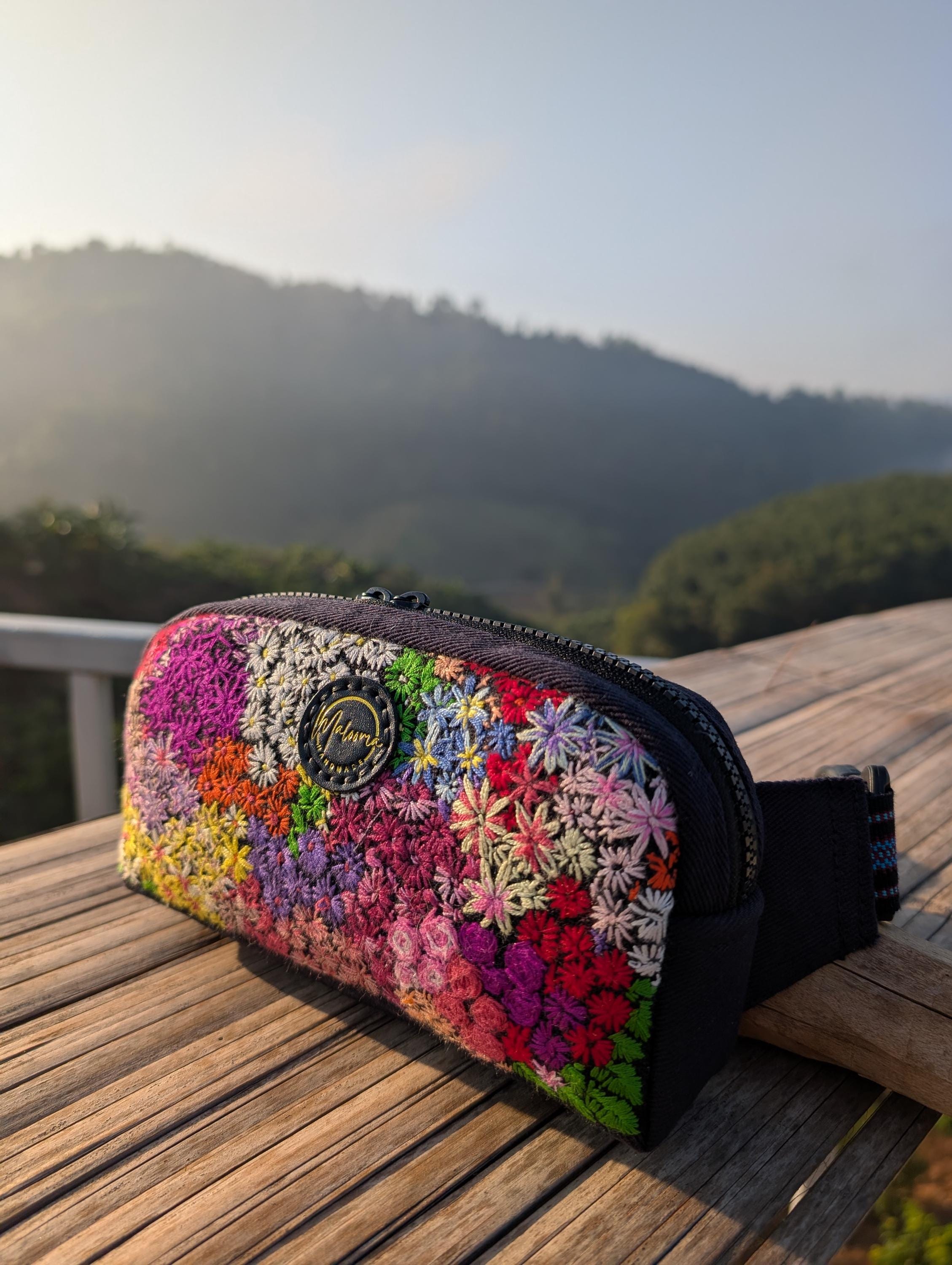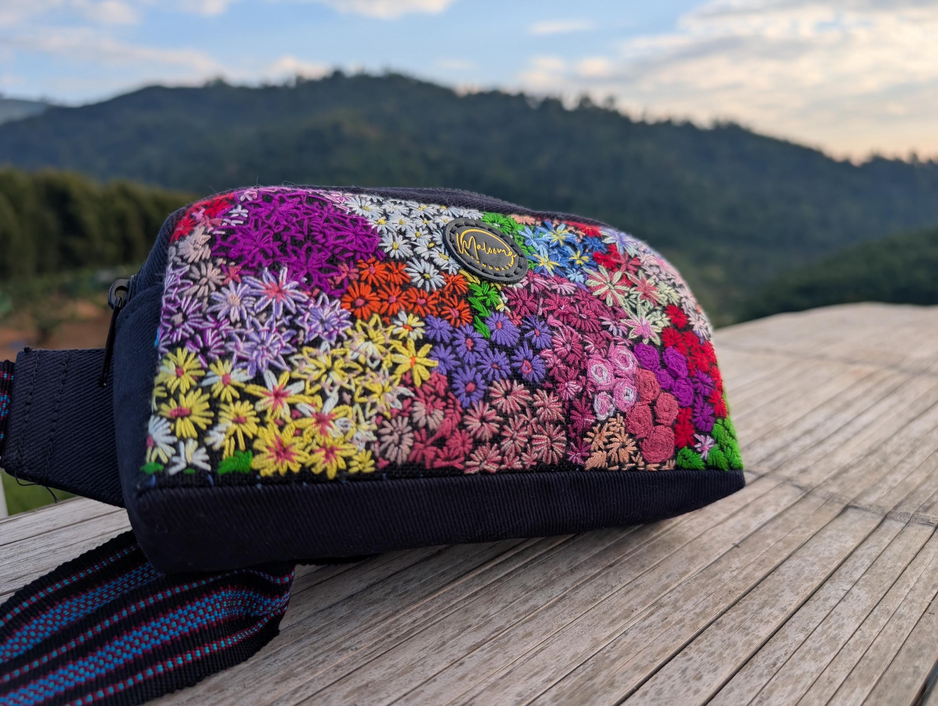 100% Hand Embroidery. All the patterns on our bag are actually hand embroidered by local people in Chiang Rai, Thailand. "For this bag, we use a hand-woven strap made by the Lisu Hill Tribe from northern Thailand."