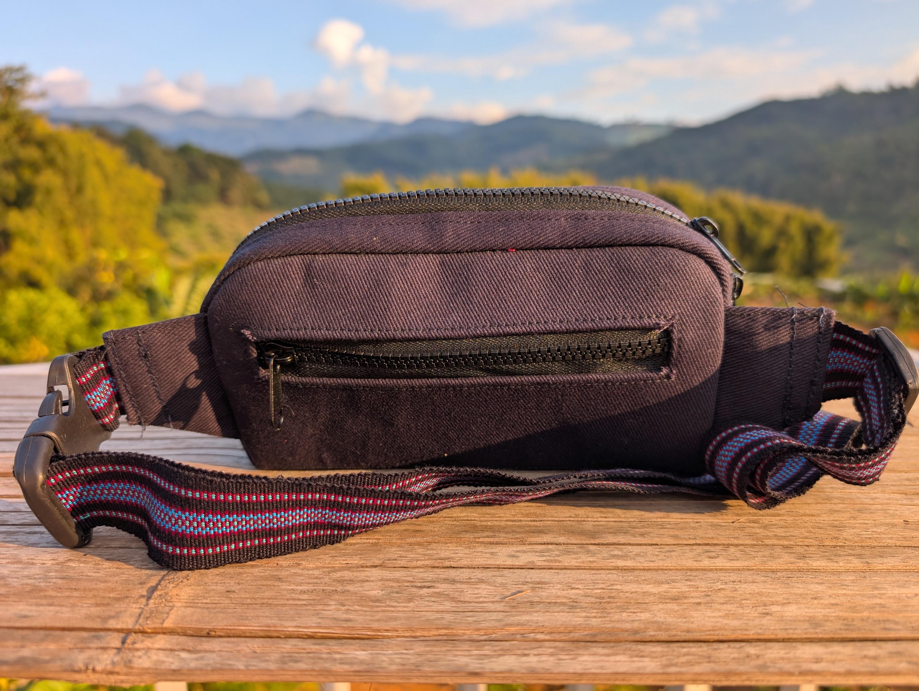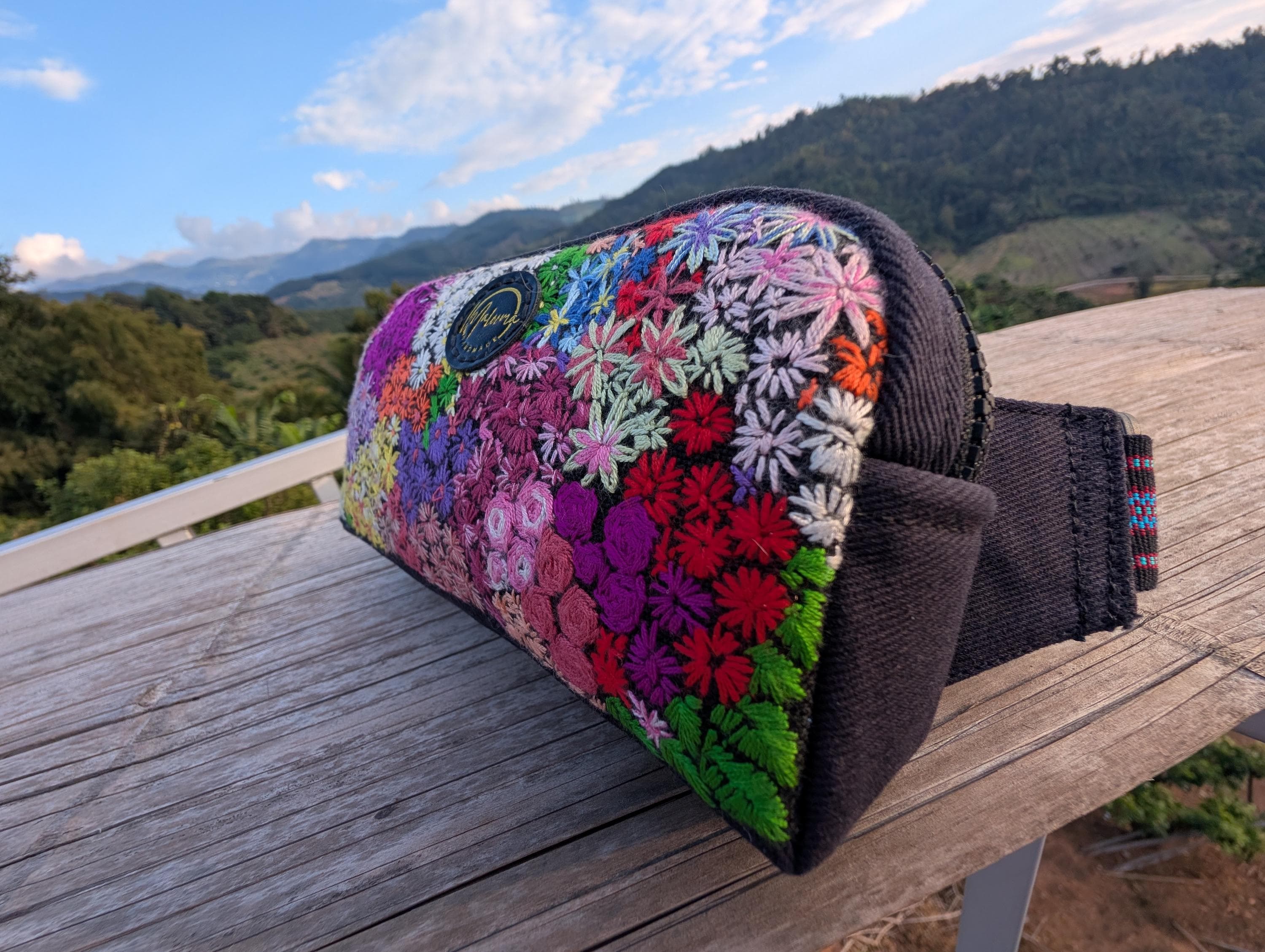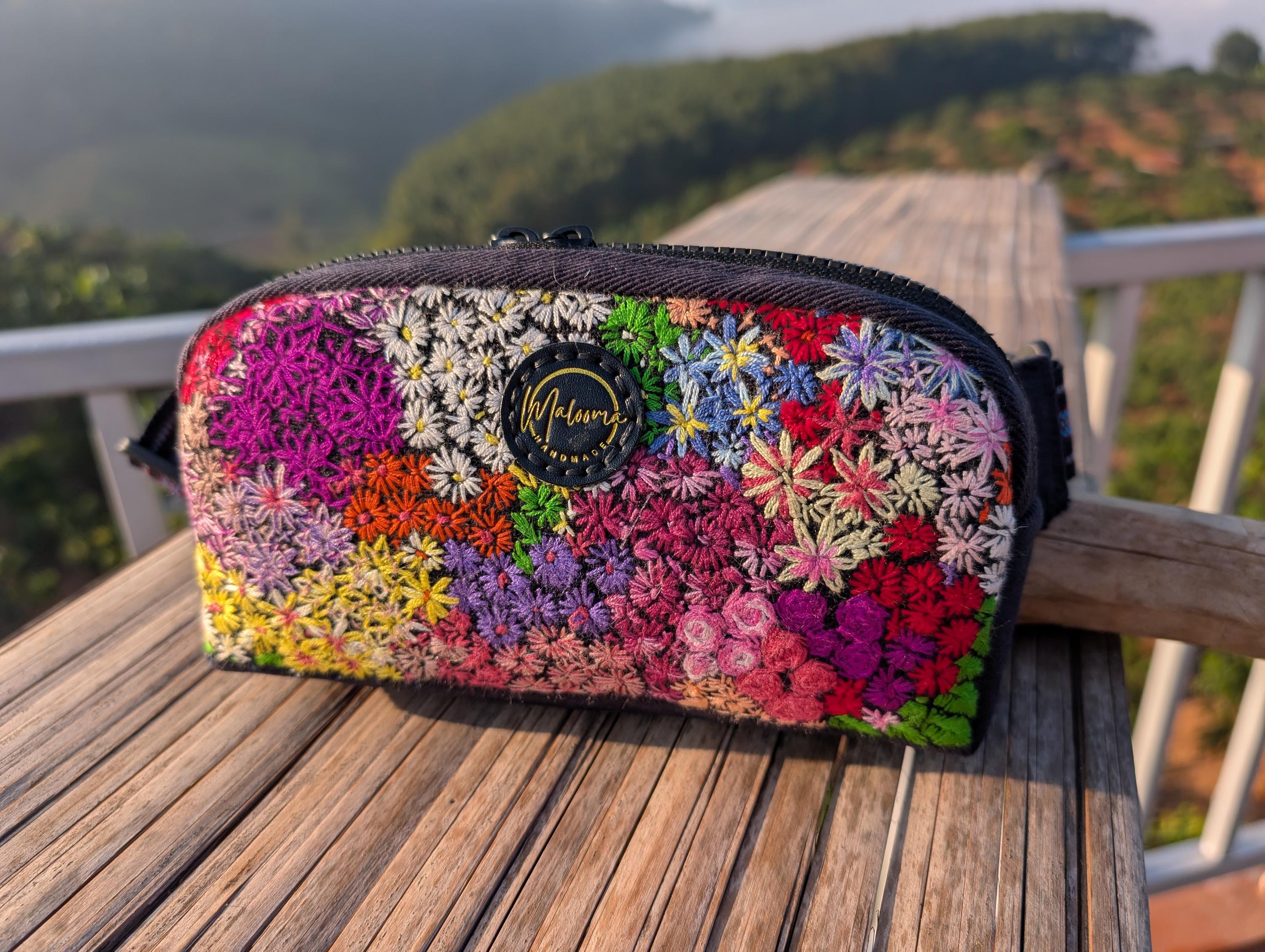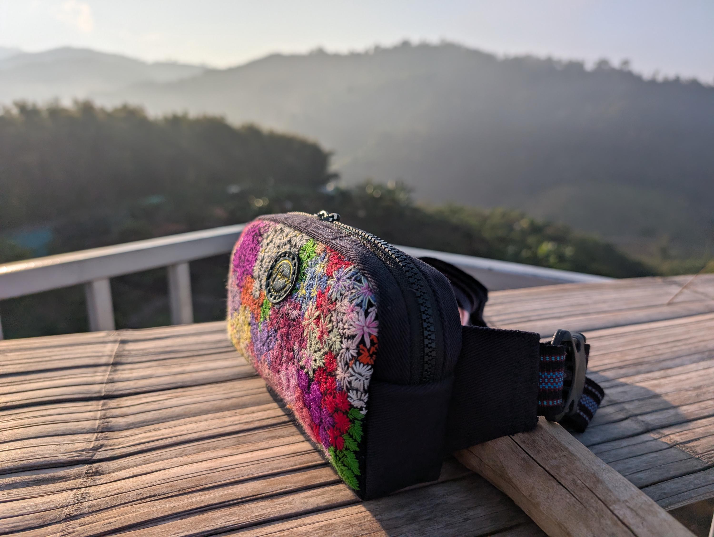 100% Hand Embroidery. All the patterns on our bag are actually hand embroidered by local people in Chiang Rai, Thailand. "For this bag, we use a hand-woven strap made by the Lisu Hill Tribe from northern Thailand."