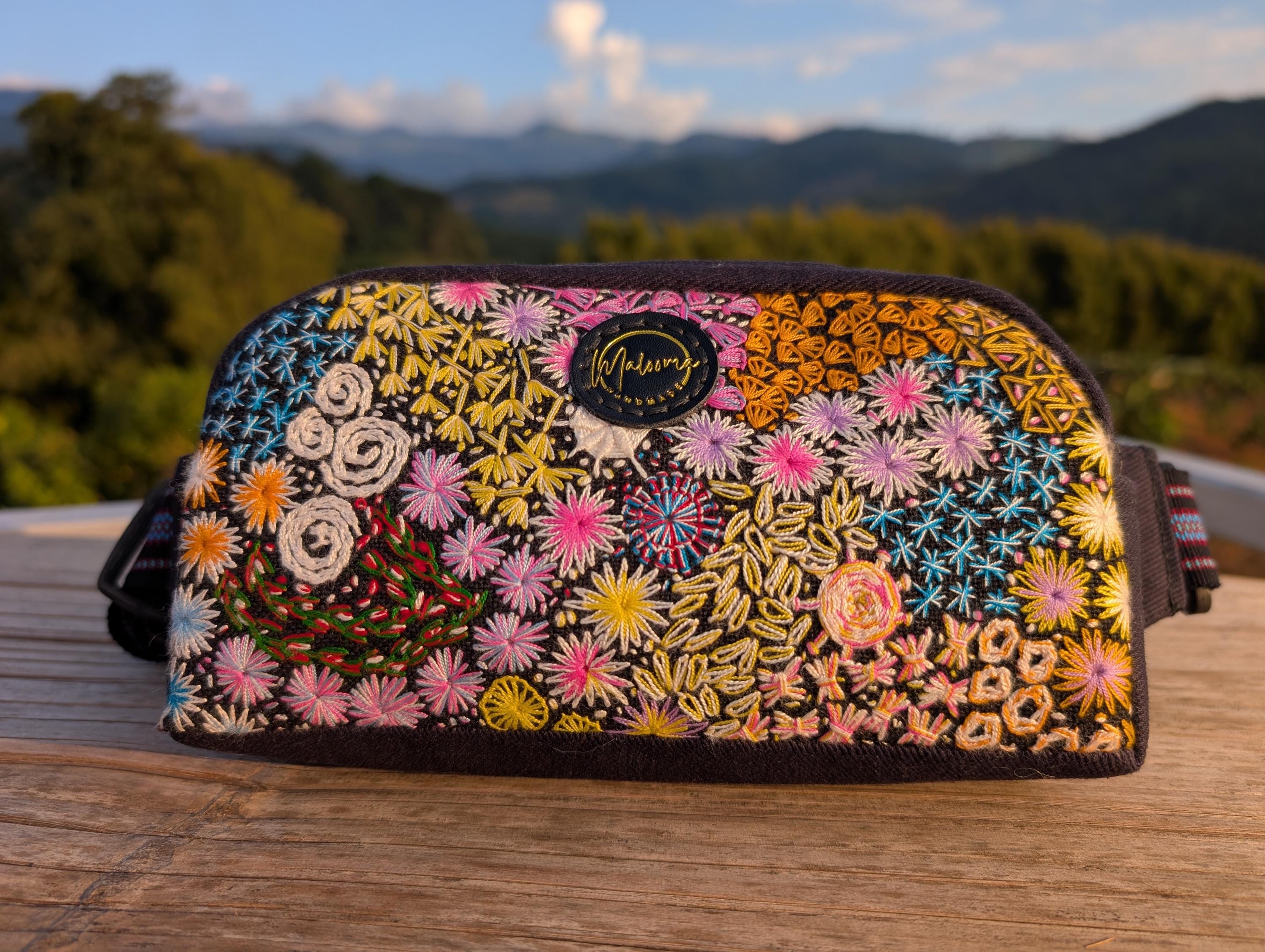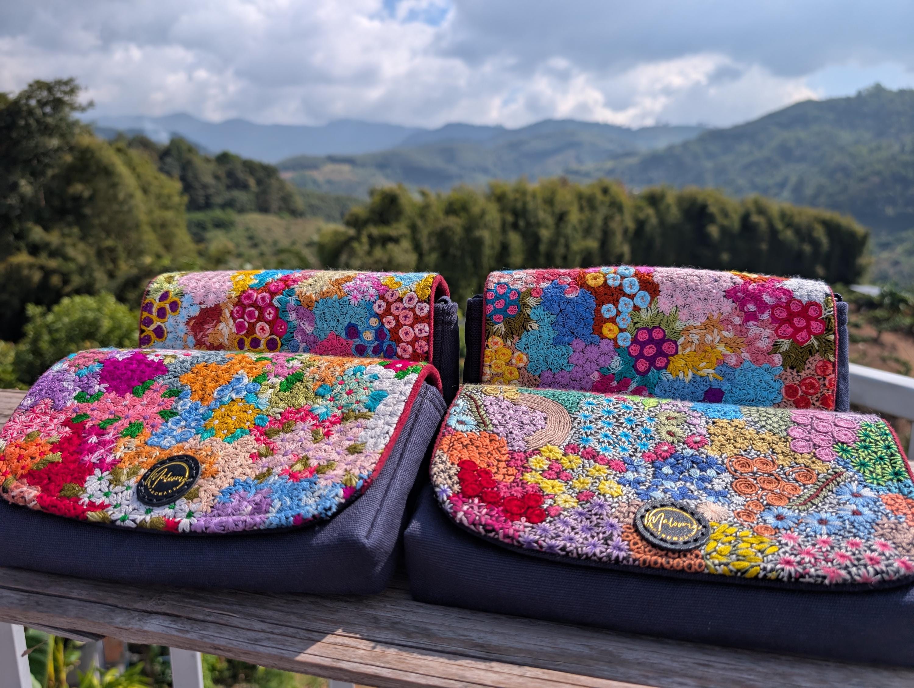 100% Hand Embroidery. All the patterns on our bag are actually hand embroidered by local people in Chiang Rai, Thailand. "For this bag, we use a hand-woven strap made by the Lisu Hill Tribe from northern Thailand."