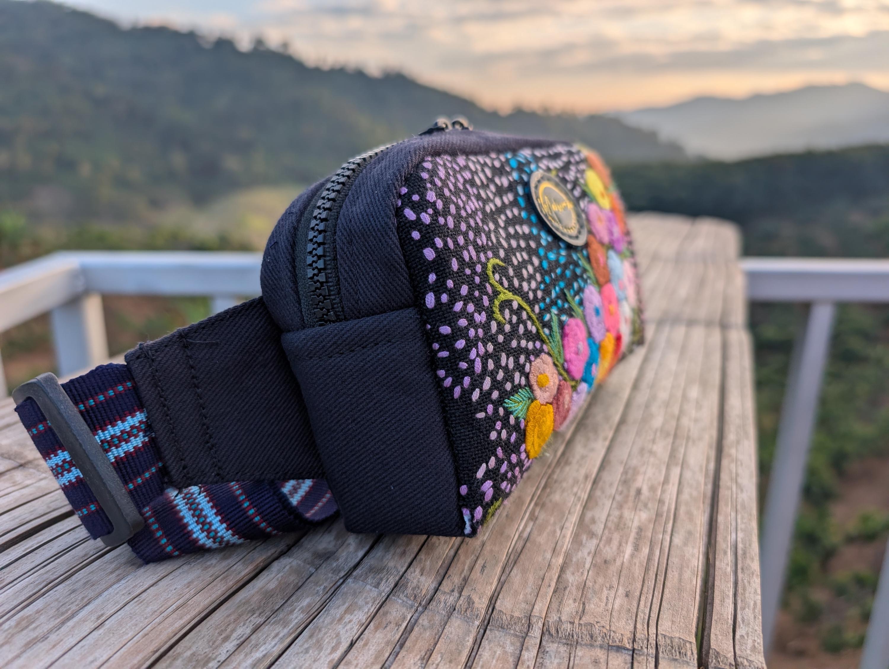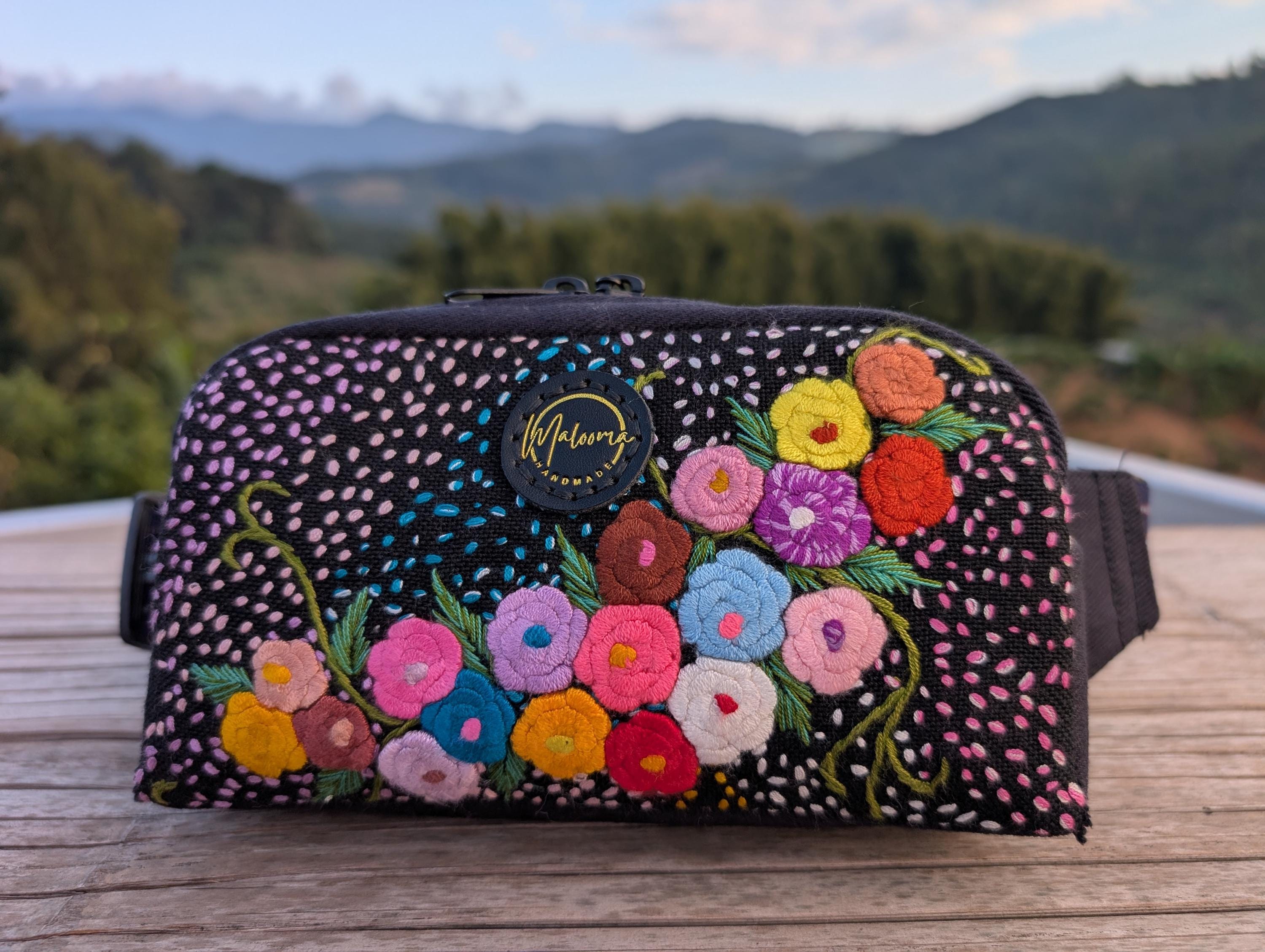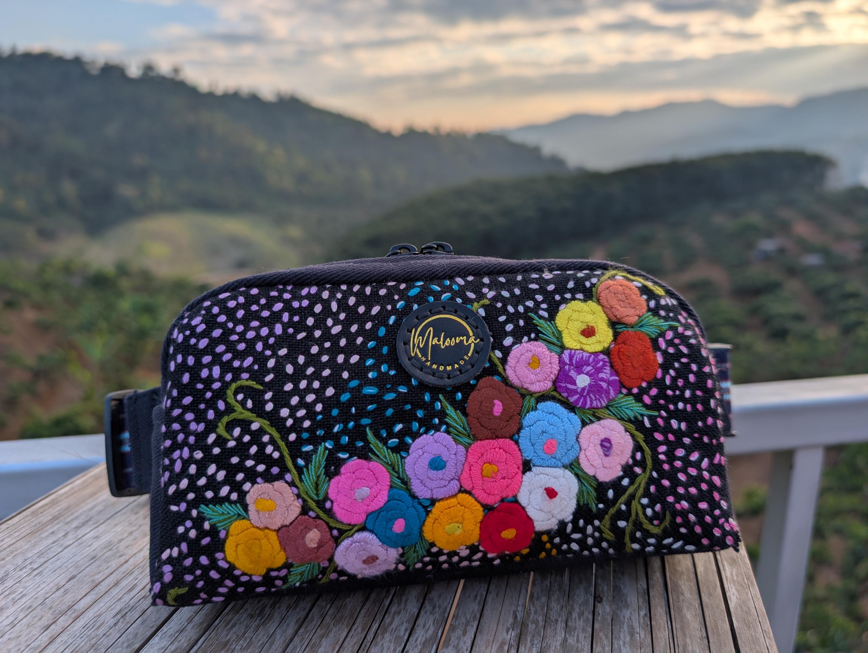 100% Hand Embroidery. All the patterns on our bag are actually hand embroidered by local people in Chiang Rai, Thailand. "For this bag, we use a hand-woven strap made by the Lisu Hill Tribe from northern Thailand."